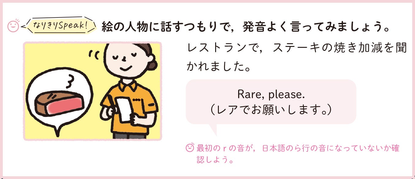 イラストを使った「なりきりSpeak!」のコーナーでは、英語を使ってみる実感を味わうことができます。また、カタカナで発音のイメージをつかめる補助もあるので、発音記号に不慣れな人でも気軽に学習することができます。