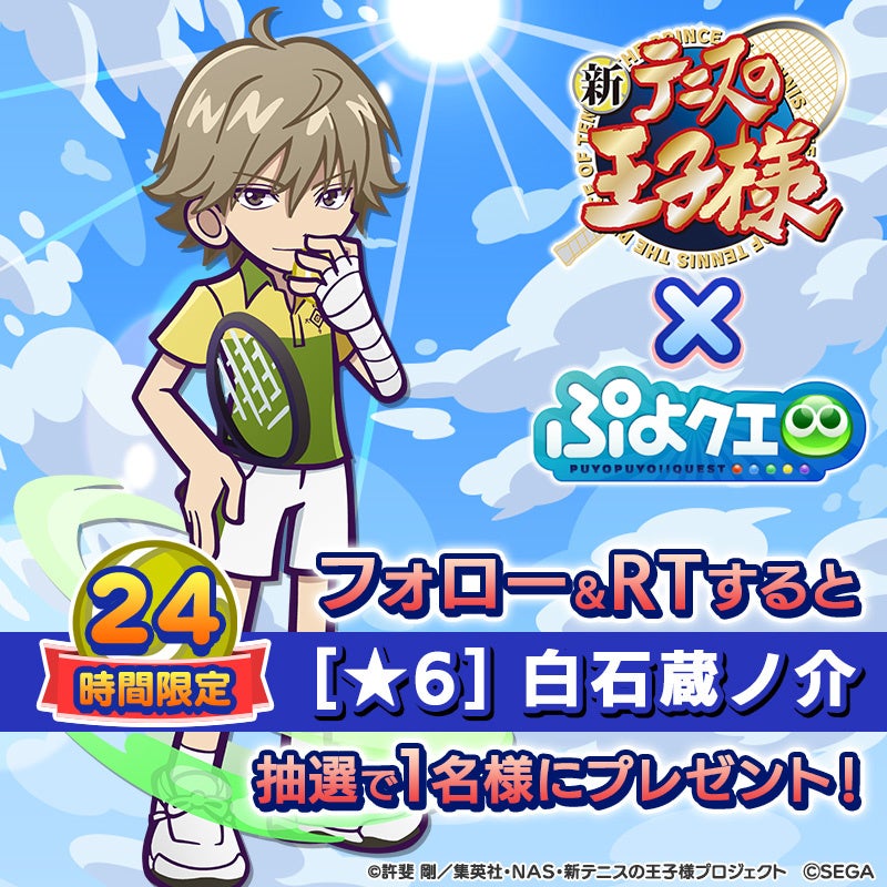 内容:『ぷよぷよ!!クエスト(ぷよクエ)』公式Twitterアカウント(https://twitter.com/puyoquest)をフォロー&対象のツイートをリツイートすると、抽選で1名様にコラボキャラクターをプレゼントするキャンペーンを、期間中の毎日、24時間限定で開催中です。ぜひご参加ください!