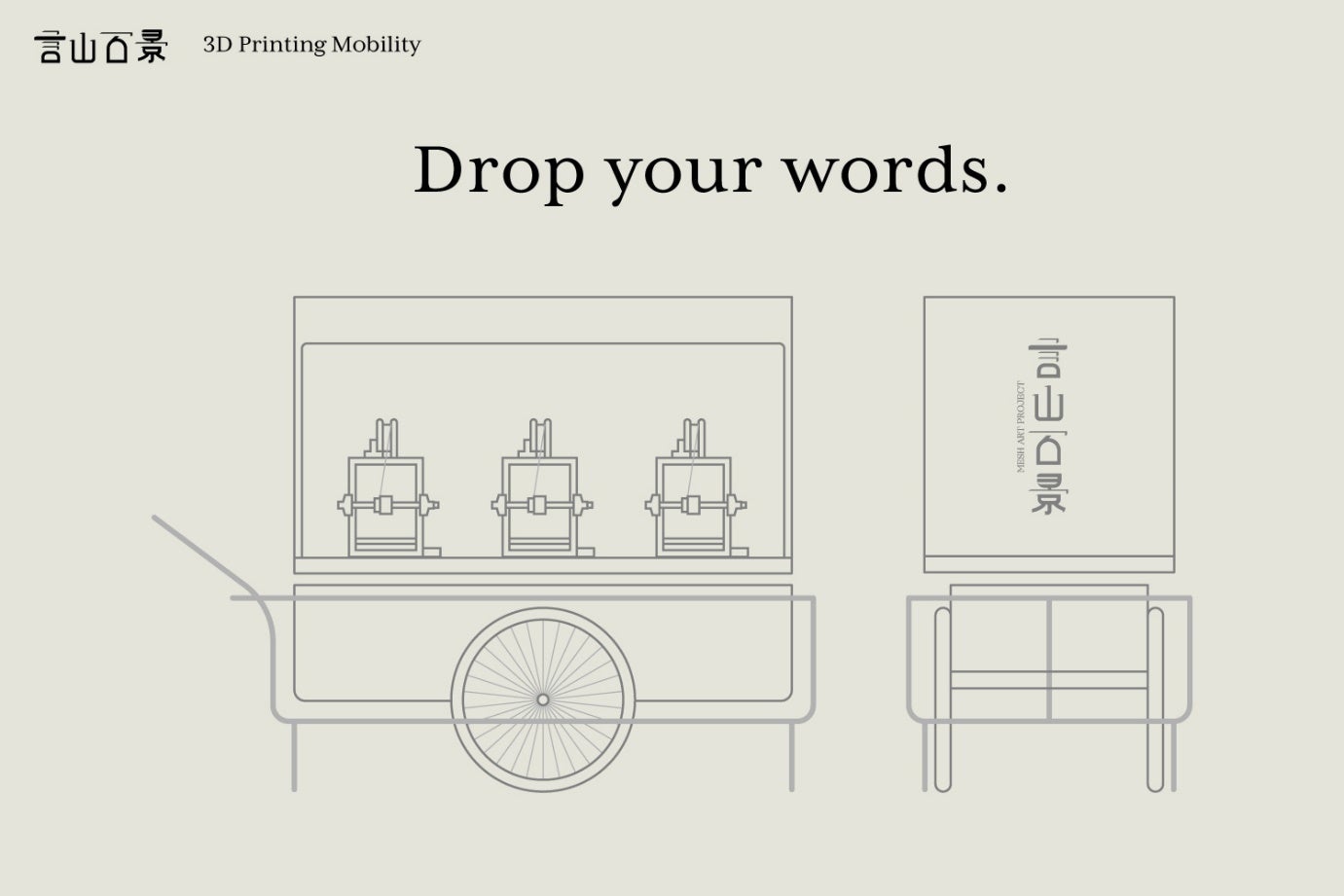 “どこか遠い地の景色”の写真を特設WEBサイトに複数枚用意。参加者はその中から一枚を選び出し、その景色に対して感じた“言葉”を投稿。その言葉は3Dプリントされ、質量をもった“言葉”となります。“言葉”はリアル会場であるBnA_WALLの会場壁面にプロジェクションされた“どこか遠い地の景色”の前に降り注ぎ、参加者とその地を繋ぐ山(言山)を築いていきます。同時に「言山」を築く一員として、参加者の名前が特設サイトにクレジットされます。