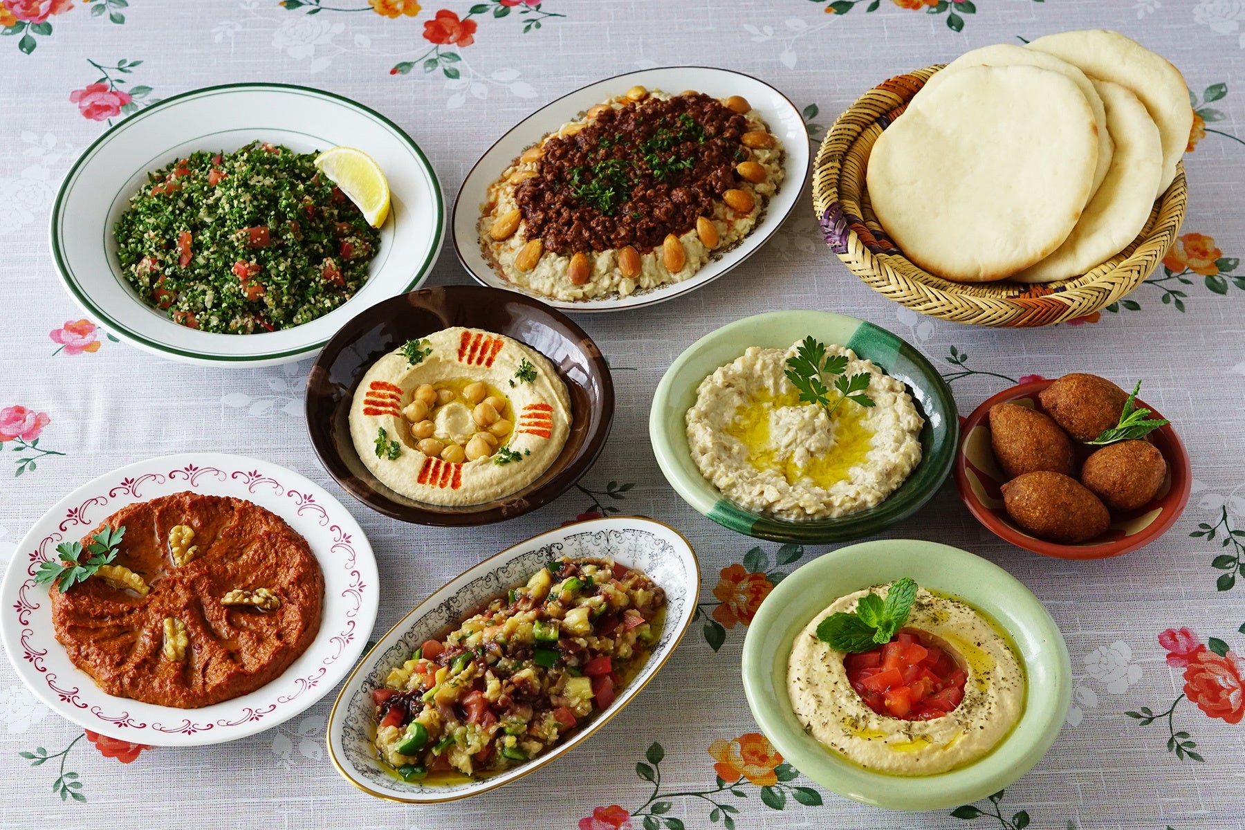 グリル3種(コフタ、ラムの串焼き、チキングリル)、ミートボールのオーブン煮込み、フライドクッベ、お米のクッバ、なすのファッテ、餃子のヨーグルト煮、揚げなすとひき肉の煮込み、チキンとくるみの煮込み、シリア風ビッグハンバーグ