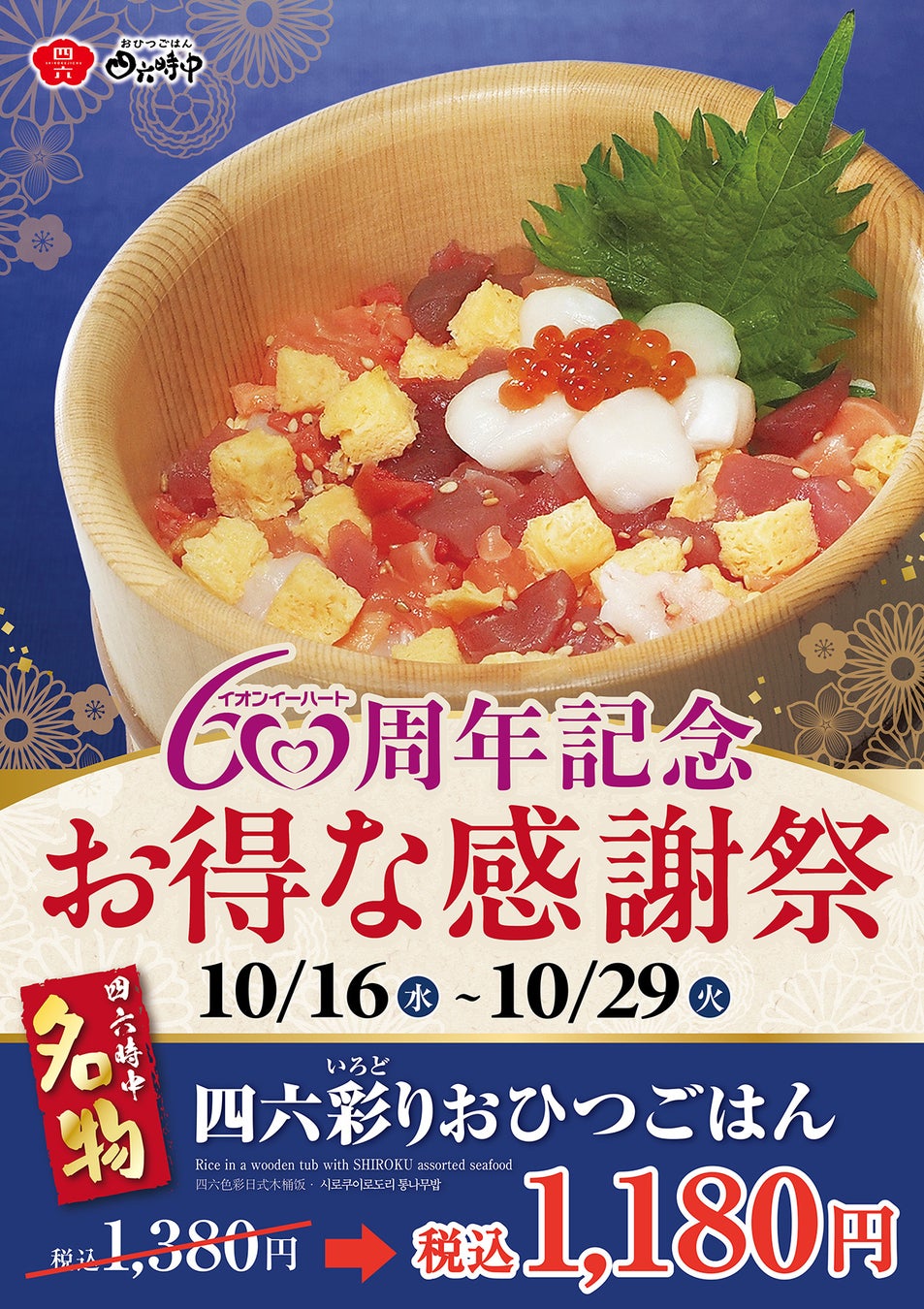 当社は、2024年7月におかげさまで創業60周年を迎えました。長きにわたるご愛顧への感謝の気持ちを込めて、創業60周年記念セールとしてテーブルレストラン『おひつごはん四六時中』にて、「四六彩りおひつごはん」通常価格1,380円(税込)を感謝価格1,180円(税込)で、10月16日(水)から10月29日(火)迄ご提供いたします。