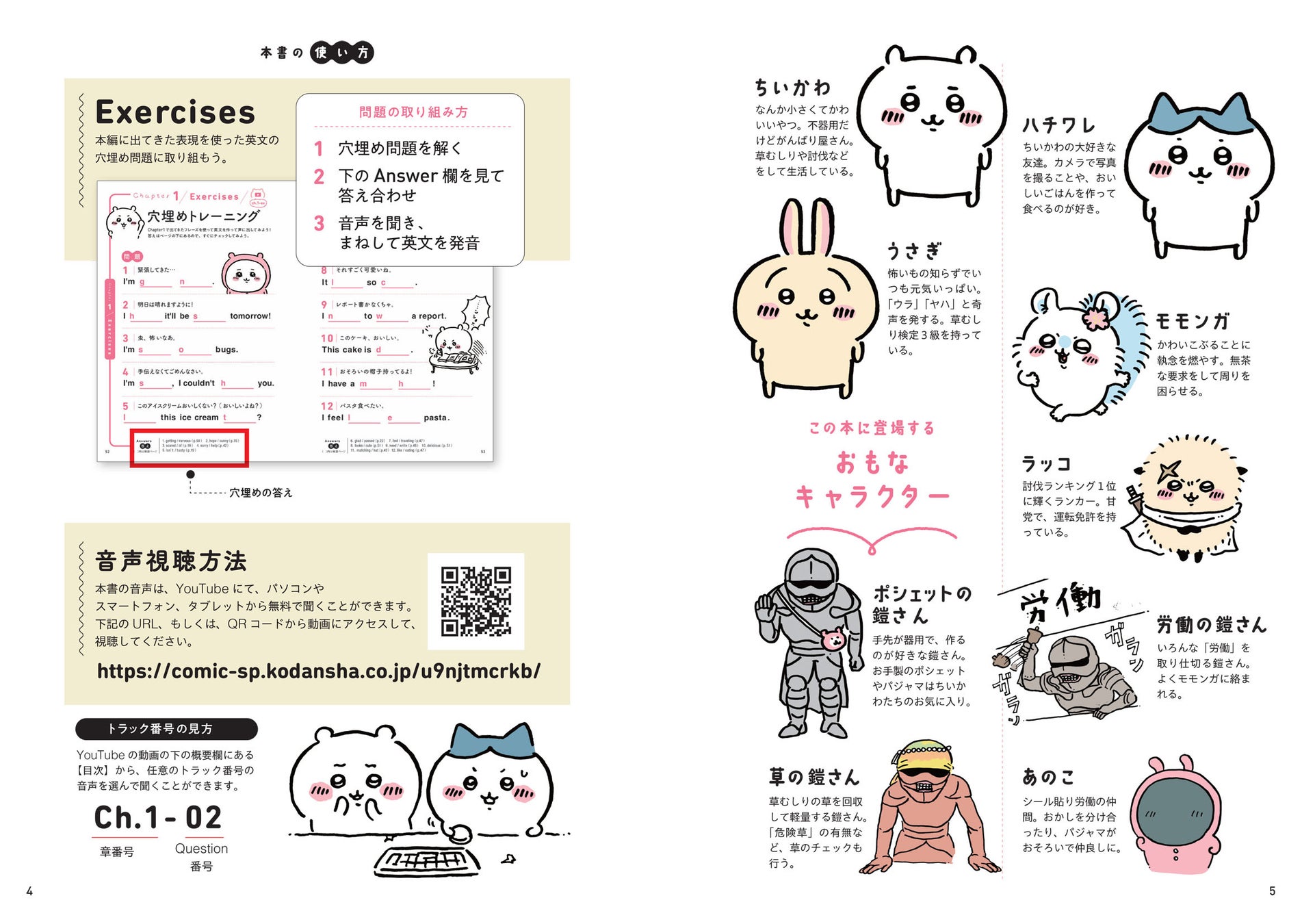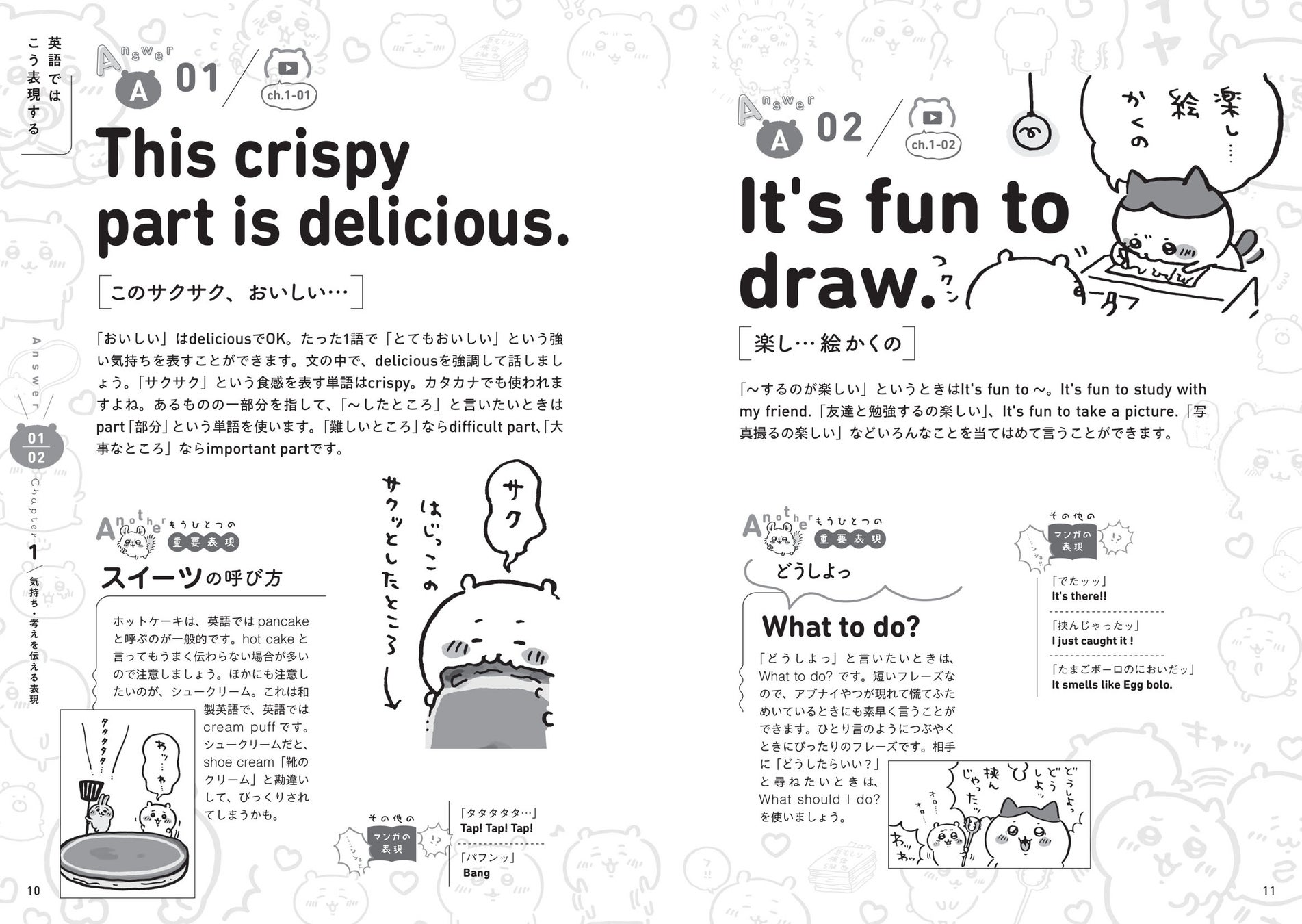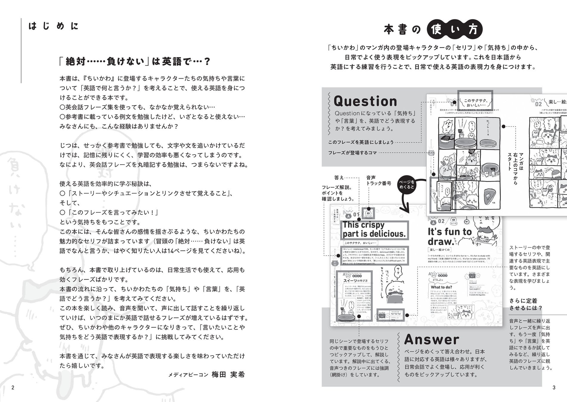 本書の流れに沿って、ちいかわたちの「気持ち」や「言葉」を、「英語でどう言うか?」を考えてみてください。この本を楽しく読み、音声を聞いて、声に出して話すことを繰り返していけば、いつの間にか英語でしゃべれるフレーズが増えているはずです。*ネイティブが話す本書掲載の英文音声もYouTubeで聞くことができるようになっています。