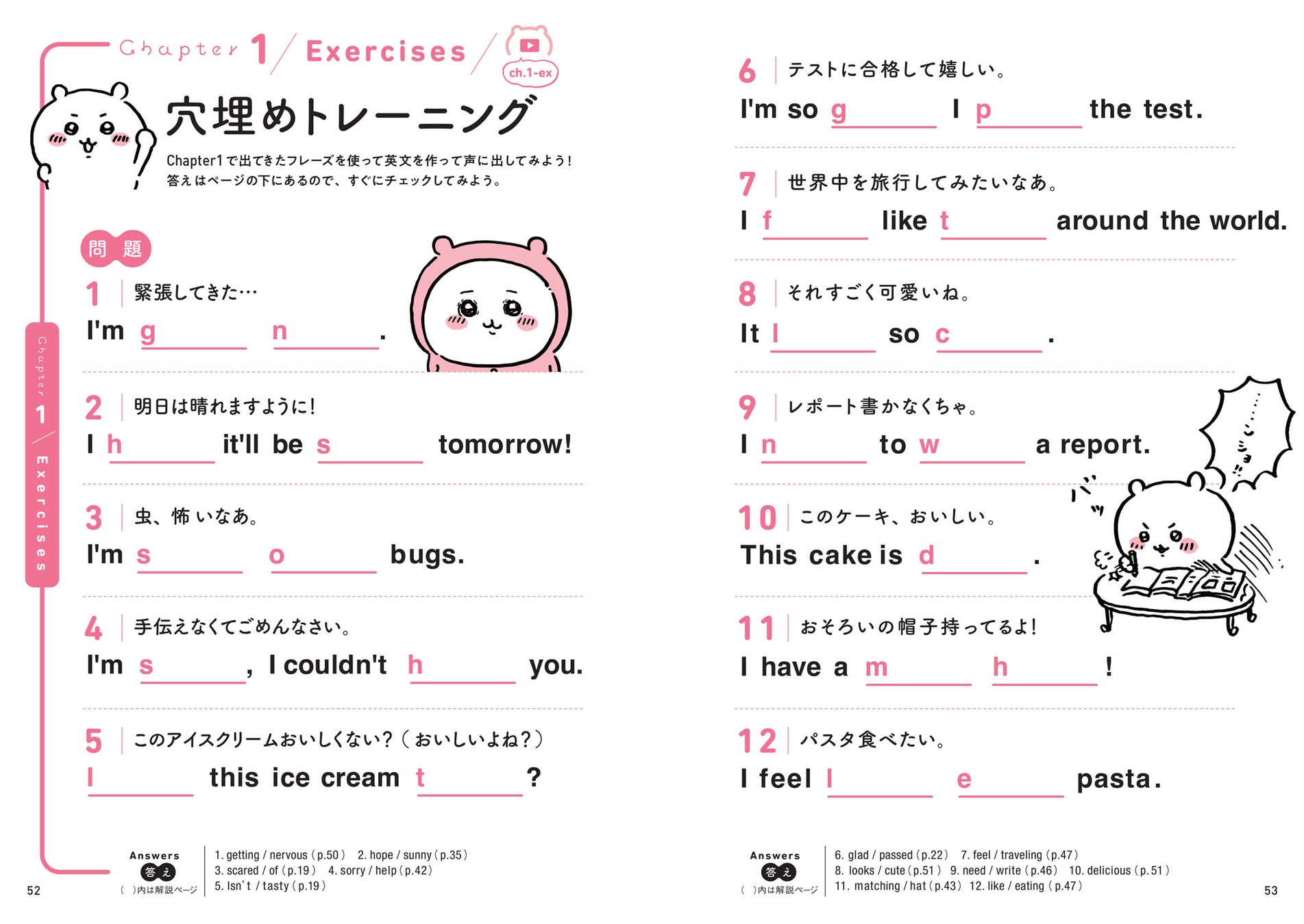 「ちいかわ」のストーリーを楽しみながら、英語フレーズが自然と身につく画期的な本です。便利なフレーズ満載! 練習問題もついているので、英語フレーズが身についたかどうかを確認することもできます。
