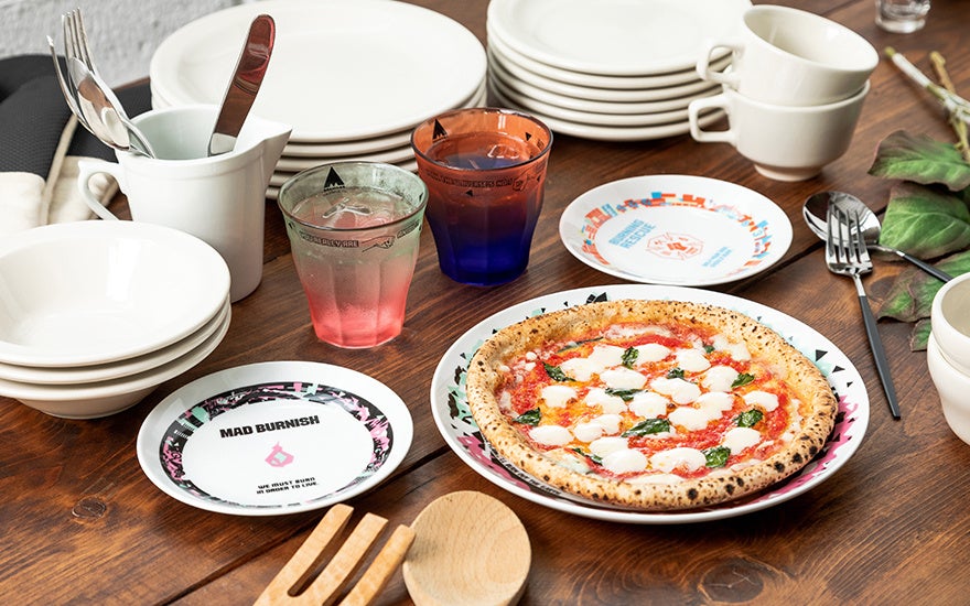 ピザをのせるのにぴったりな大皿、取り分けに使える小皿、ガロとリオをイメージしたカラーのグラスの5点セット。