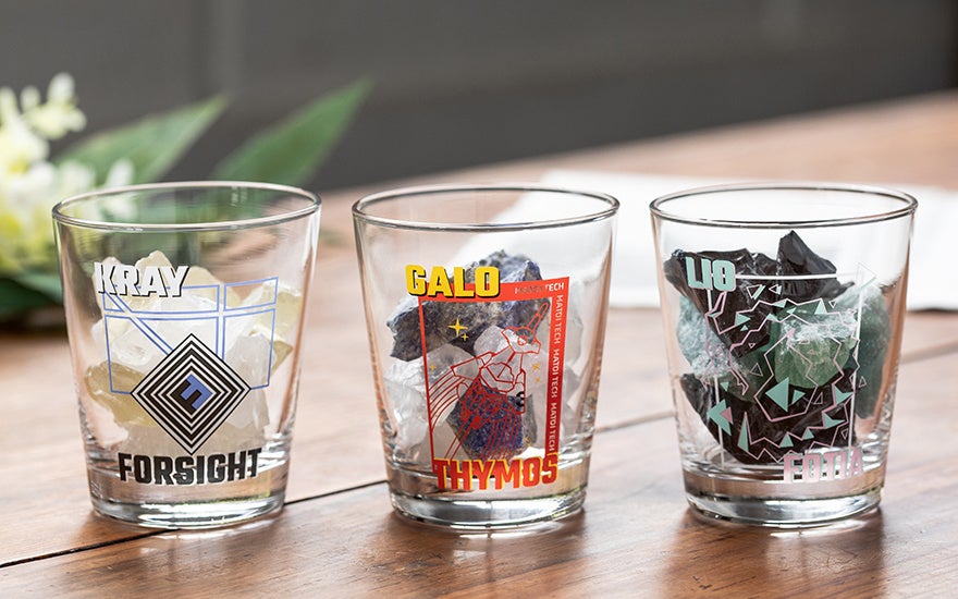 グラスには各キャラクターの名前とモチーフをプリント。彼らをイメージしたカラーのストーンにアロマオイルを垂らして素敵な香りをお楽しみください。