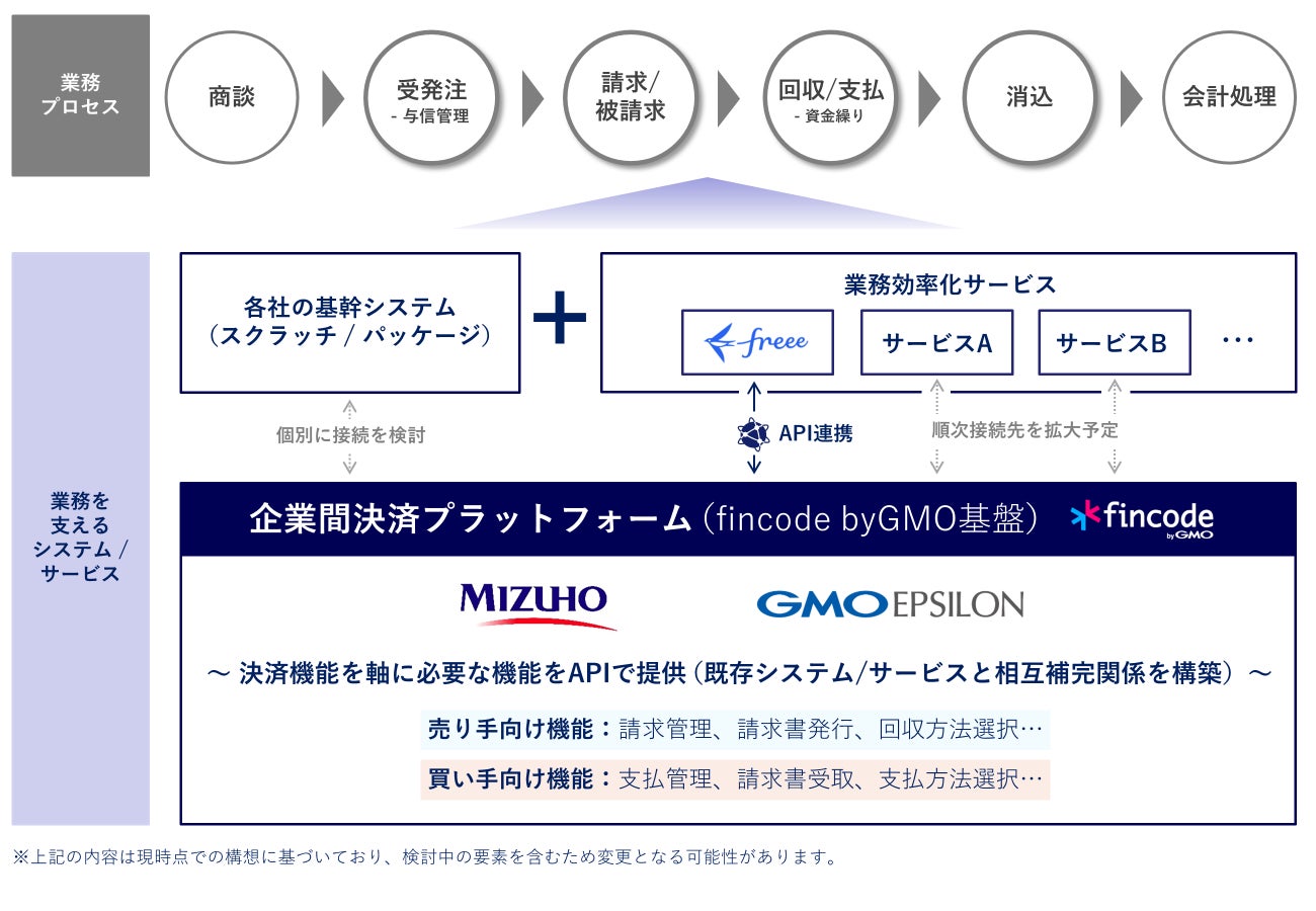 新しい企業間決済プラットフォームは、GMO-EPが提供するオンライン決済インフラ「fincode byGMO」を活用して構築し、みずほ銀行とGMO-EPにて推進する予定です。GMO-PGはGMO-EPと相互に連携して構築・推進に向けて助言を行います。