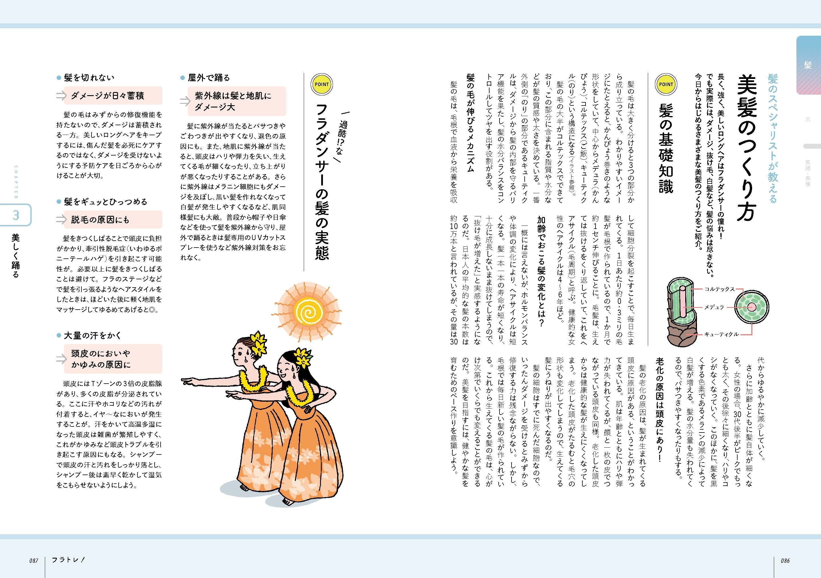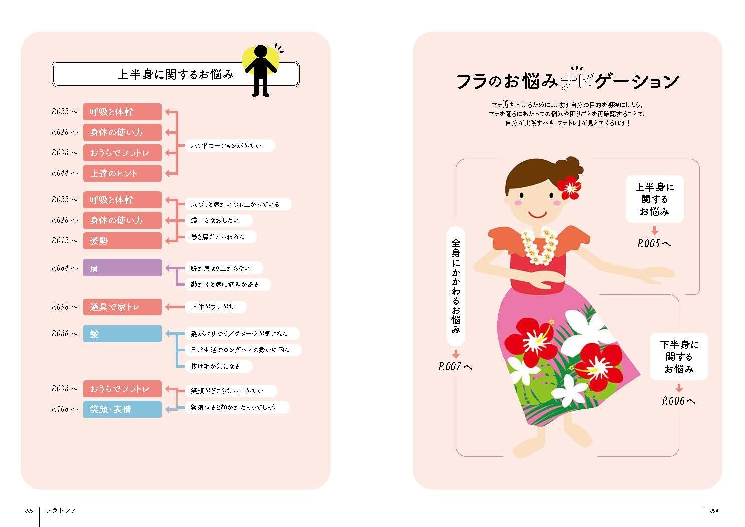 フラダンサーたちの悩みや思いを代表する上記3つのテーマで章を分け、ストレッチやエクササイズなどを中心に解決策をご紹介します。「フラダンサーのため」に特化した内容なので、きっと各自の「フラ力(りょく)アップ」に直結するはずです。