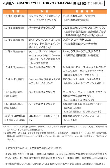 プロジェクトの一環として、自転車の活用促進・安全啓発を図るため、都内区市町村の事業と連携して「GRAND CYCLE TOKYO CARAVAN」を開催。様々なサイクルスポーツを都内各地で体験いただけるほか、より安全に自転車をご利用いただけるようヘルメット着用促進に向けた取組等も行います。