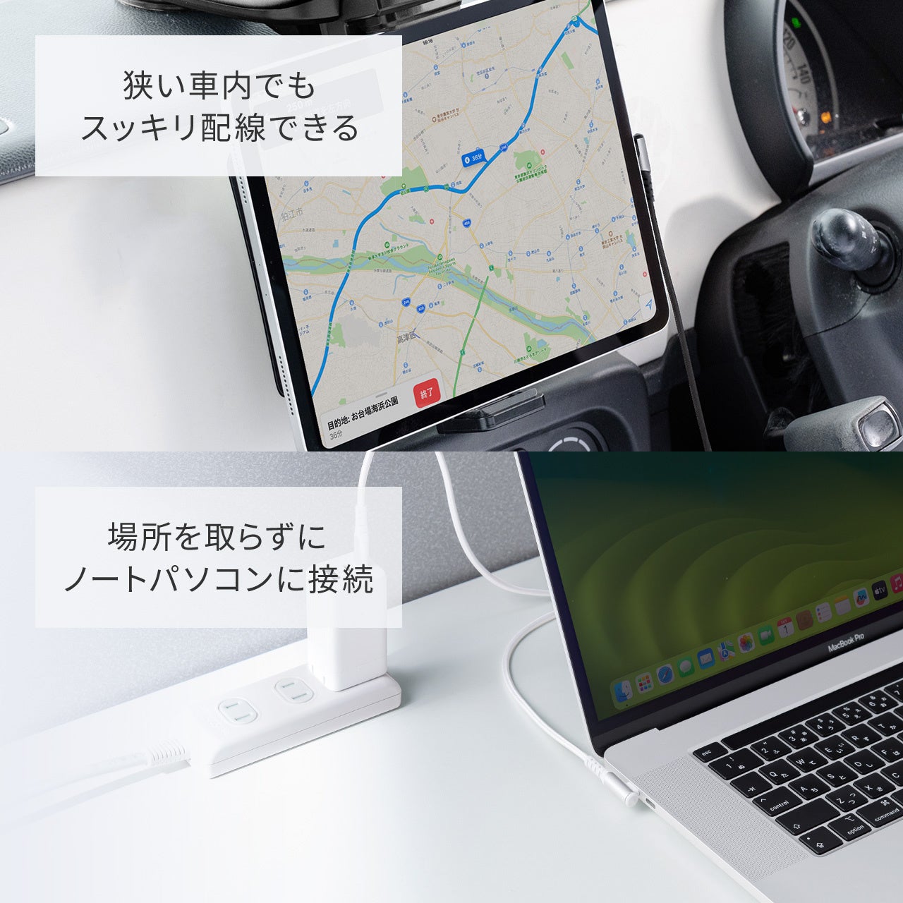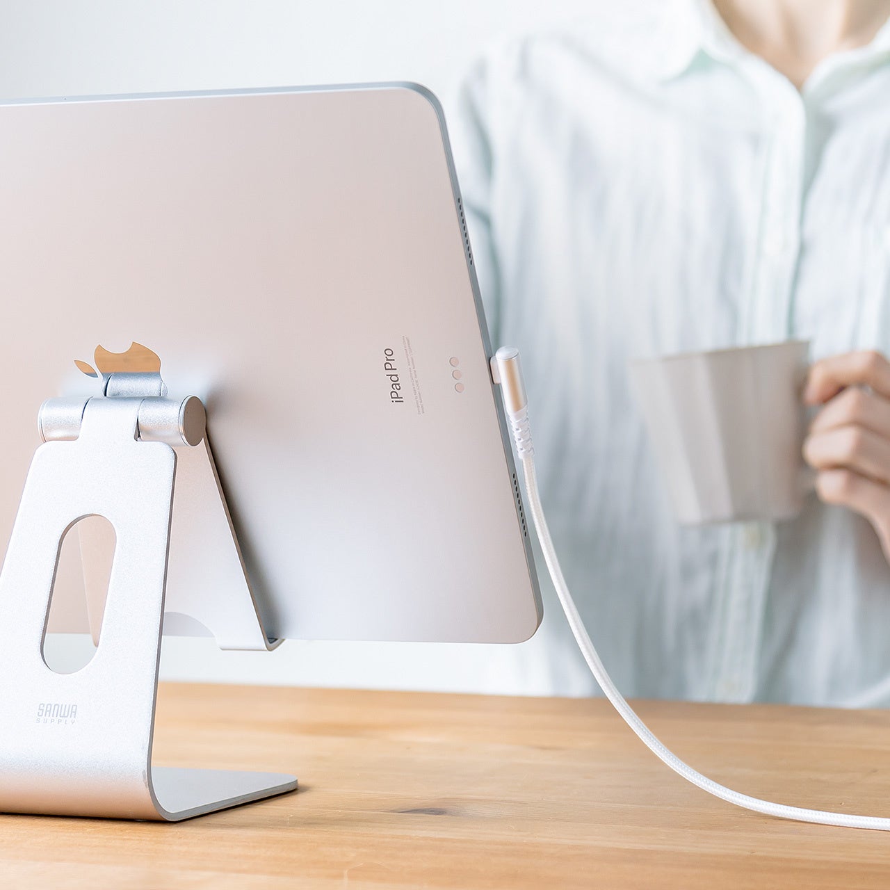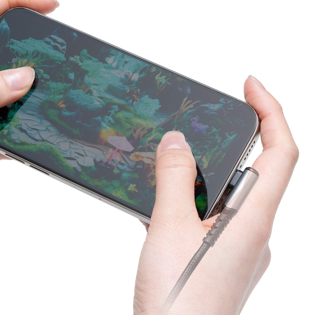 飛び出しが少ないL字コネクタは充電しながらのスマホゲームやタブレットでの動画視聴に最適です。