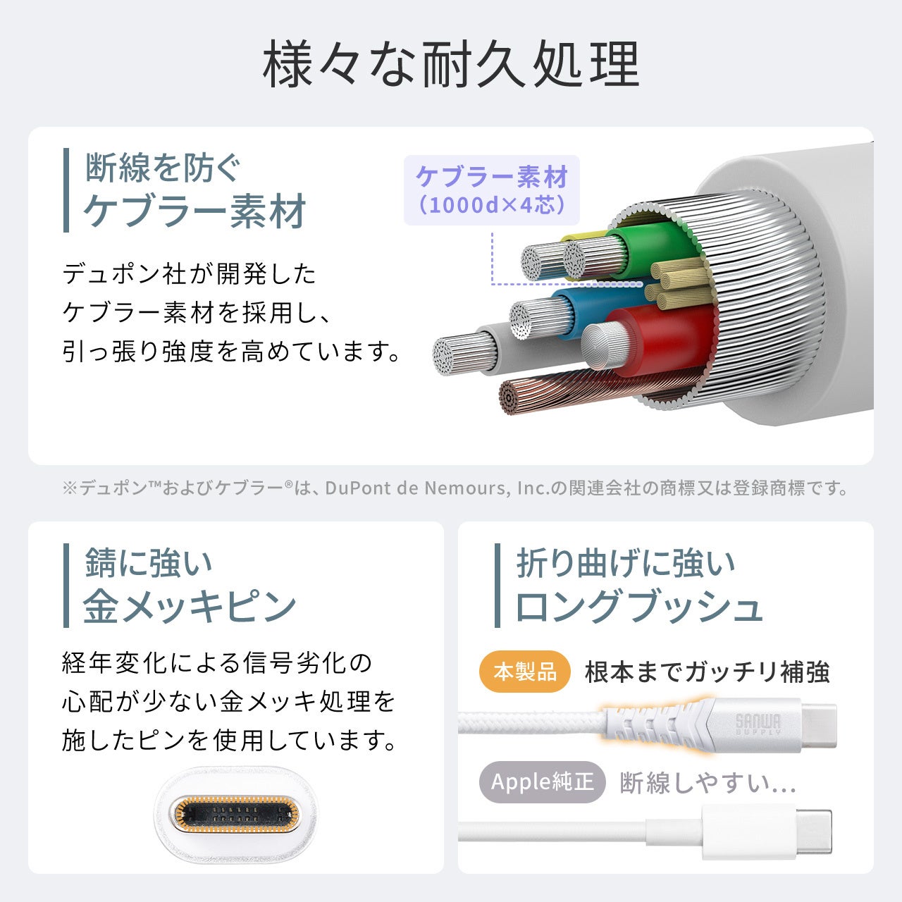 ケーブルには防弾チョッキの素材としても使用されるケブラー繊維採用で、引っ張りなどの負荷による断線を防止します。