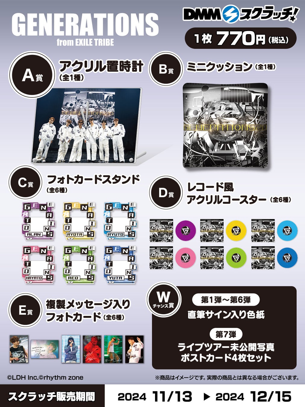 合同会社DMM.com(本社:東京都港区、会長 兼 CEO亀山敬司、https://dmm-corp.com/ 以下DMM )は、ハズレなしのオンラインくじサービス「DMMスクラッチ」にて、2024年11月13日(水)よりGENERATIONS LIVE TOUR 2024 "GENERATIONS 2.0"の完走を記念して、「GENERATIONS スクラッチ」を販売いたします。本くじでは、DMMスクラッチ限定の多彩なラインナップと共に、メンバーのサイン入り色紙などが抽選で当たるWチャンス賞を計33日間開催いたします。