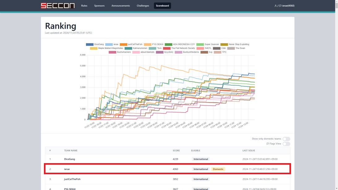 その中でも「SECCON CTF」はメインイベントのハッキングコンテストで、予選を勝ち抜いた世界各国の強豪チームがサイバーセキュリティの技術力を競い合います。「SECCON CTF 13 Quals(SECCON CTF 13 予選)」ではオンラインで合計653チームが参加しました。GMOイエラエは4,060ポイントを獲得し国内1位、世界2位 (1位のチームとの差は179ポイント) で予選を通過しました。