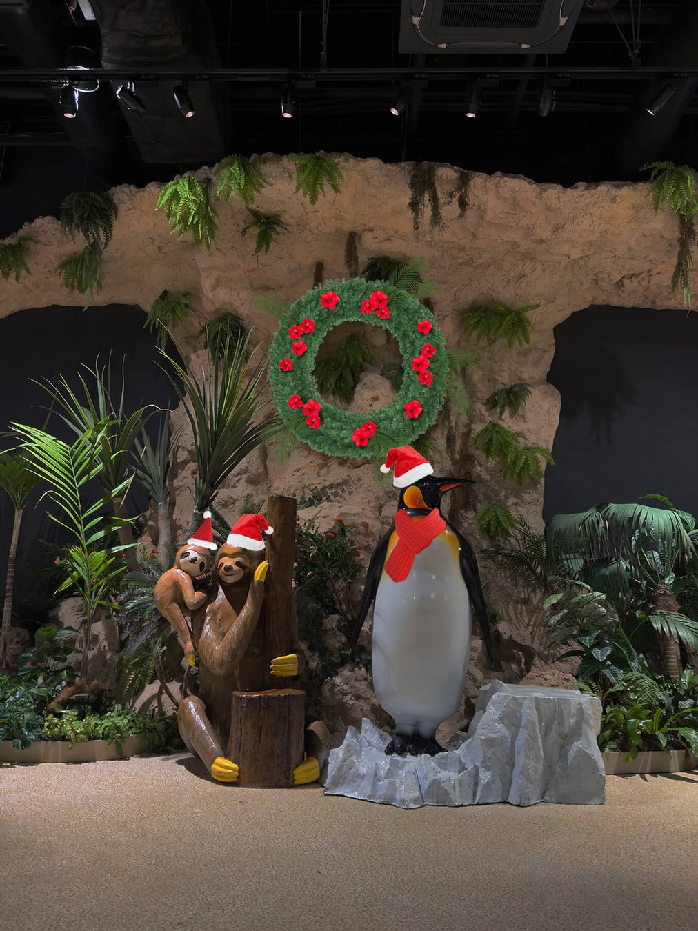 2階のうみかじドーム前のスペースでは、1時間に1回クリスマスソングと共に雪が舞う演出を実施します。沖縄では見ることができない雪の降るクリスマスの雰囲気をお楽しみいただけます。さらに、同エリアでは1日2回ペンギンが飼育エリアからソリに乗って現れ、間近でペンギンを見ることができるクリスマス限定ペンギンイベントも開催します。