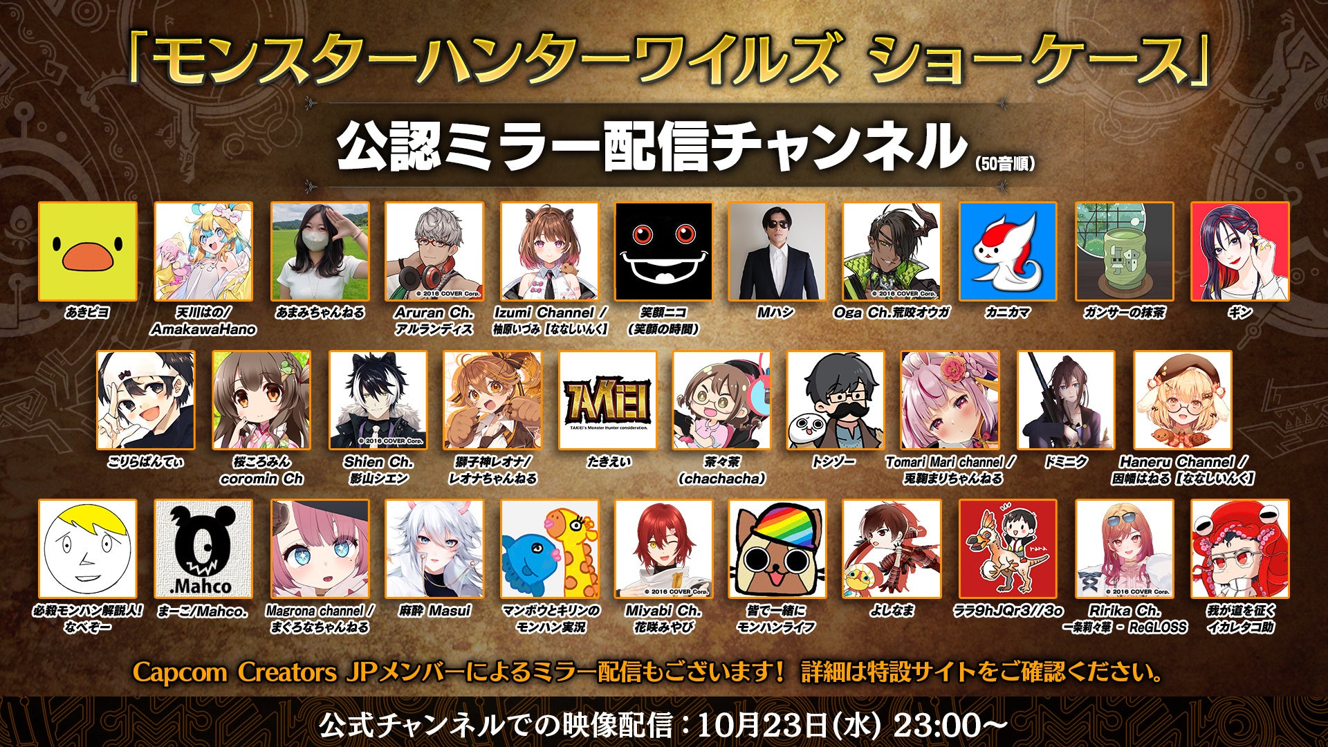 10月23日(水)23:00から配信予定の「モンスターハンターワイルズ ショーケース」を人気配信者の皆さんと一緒に楽しめるミラー配信! カプコン公式YouTubeチャンネルで視聴してもよし、好きな配信者と一緒に盛り上がるもよし。