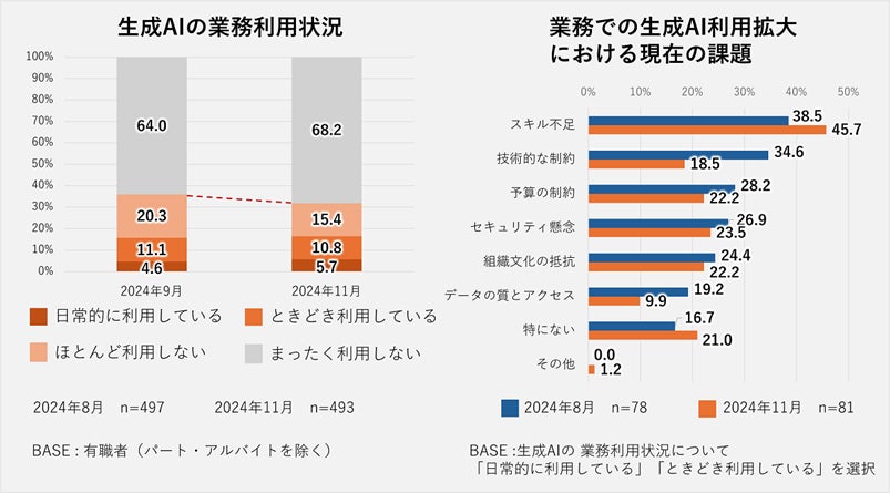 ■生成AIの業務利用状況と業務利用拡大における課題(2024年8月と2024年11月の比較)