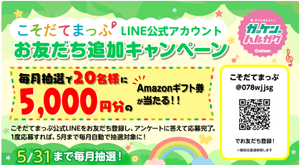 ガッケンのハルガク2023「こそだてまっぷLINE公式アカウントお友だち追加キャンペーン」毎月20名様に5,000円分のAmazonギフト券が当たる!! (応募最終〆切5/31)