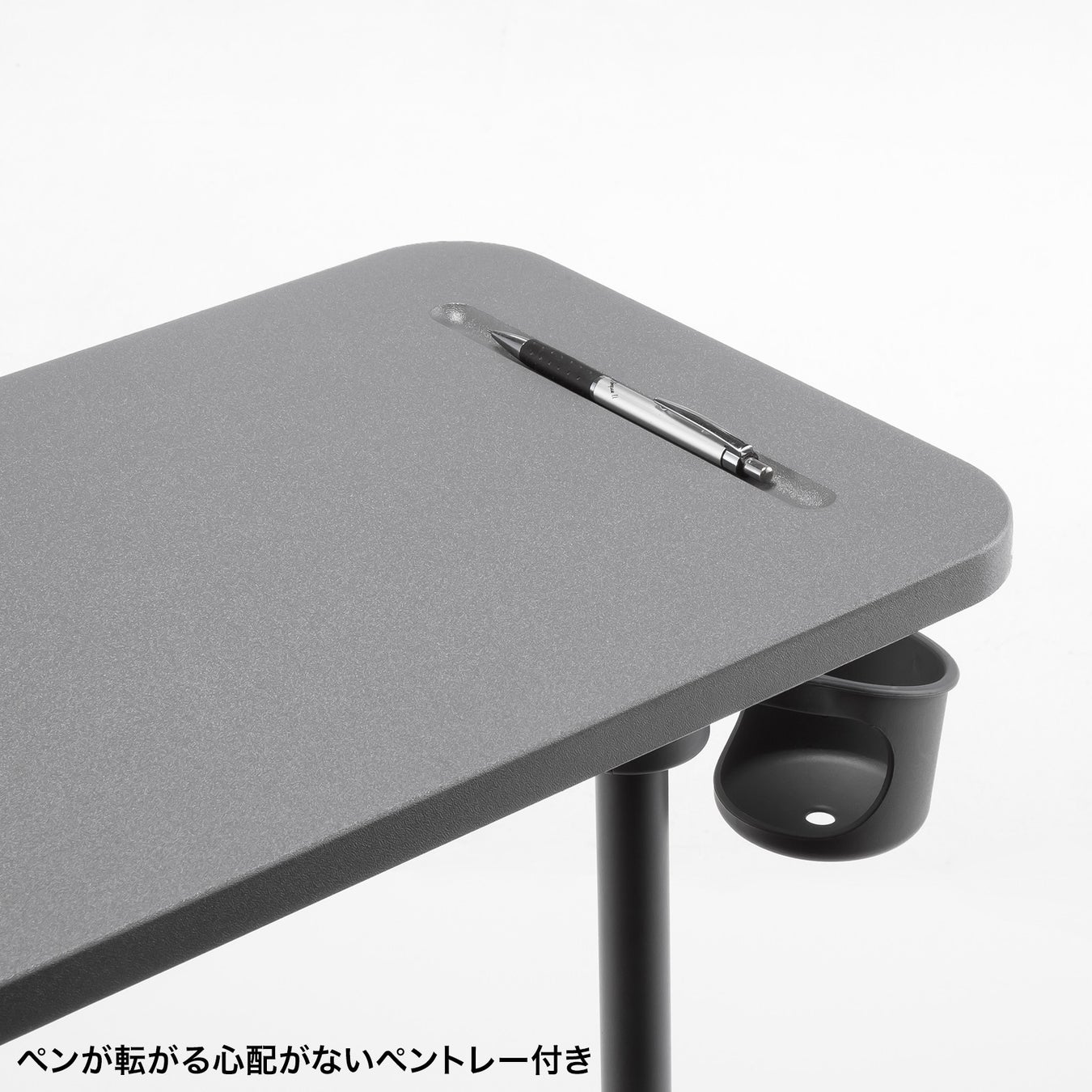大型サイズのサイドテーブル付きです。天板幅550×奥行き300mmでA4ノートを広げて置けます。耐荷重は約20kgで、サンワサプライ製CR-LATAB14Nなどのタブレットホルダー(別売り)を取り付けることもできます。