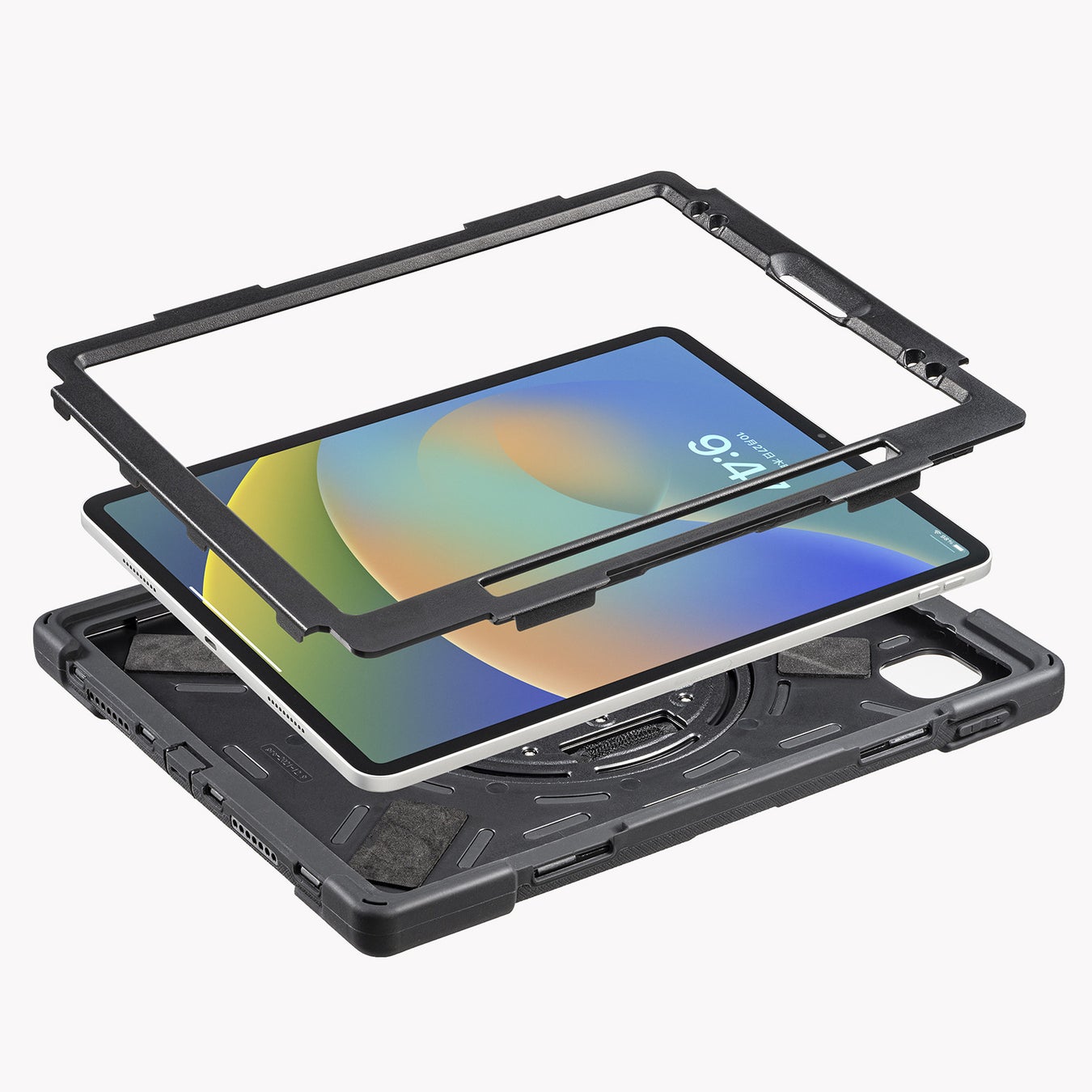 iPadを挟み込み強靭に守るハードカバーと、その外側で衝撃を格段に和らげるシリコン素材の二重構造を採用しています。角落ちなどの衝撃から大切なiPadを守ります。