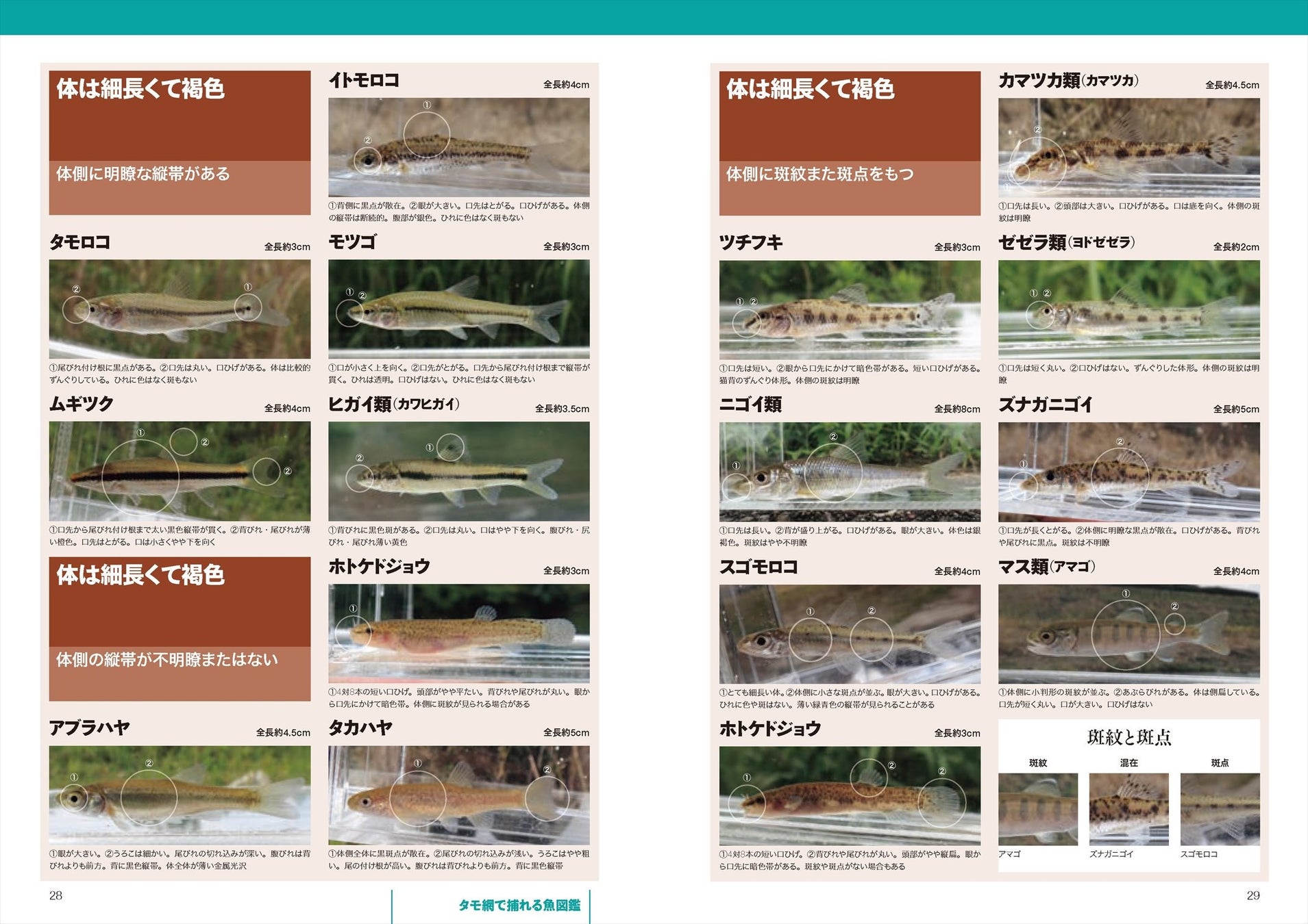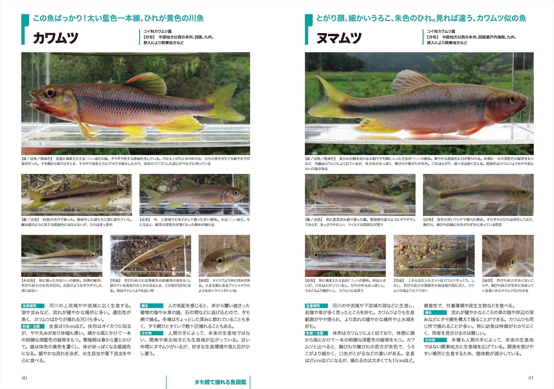 見分けるための注目ポイントを種ごとに紹介しているので、「小さな銀色の魚はすべてメダカに見える… 」「コイ科の何かとか、ハゼ科の仲間までは分かるんだけど… 」といった識別の悩みも解決!