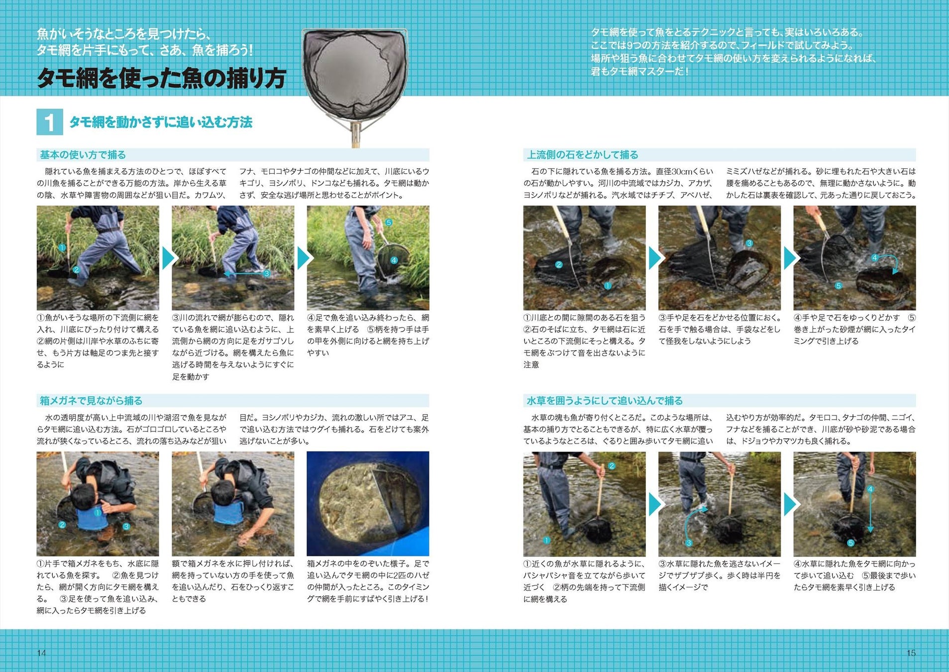 適当に網を入れていても魚は意外と捕れますが、魚捕りに熟練した著者がよりたくさん、いろいろな魚を捕るためのテクニックを惜しみなく公開!