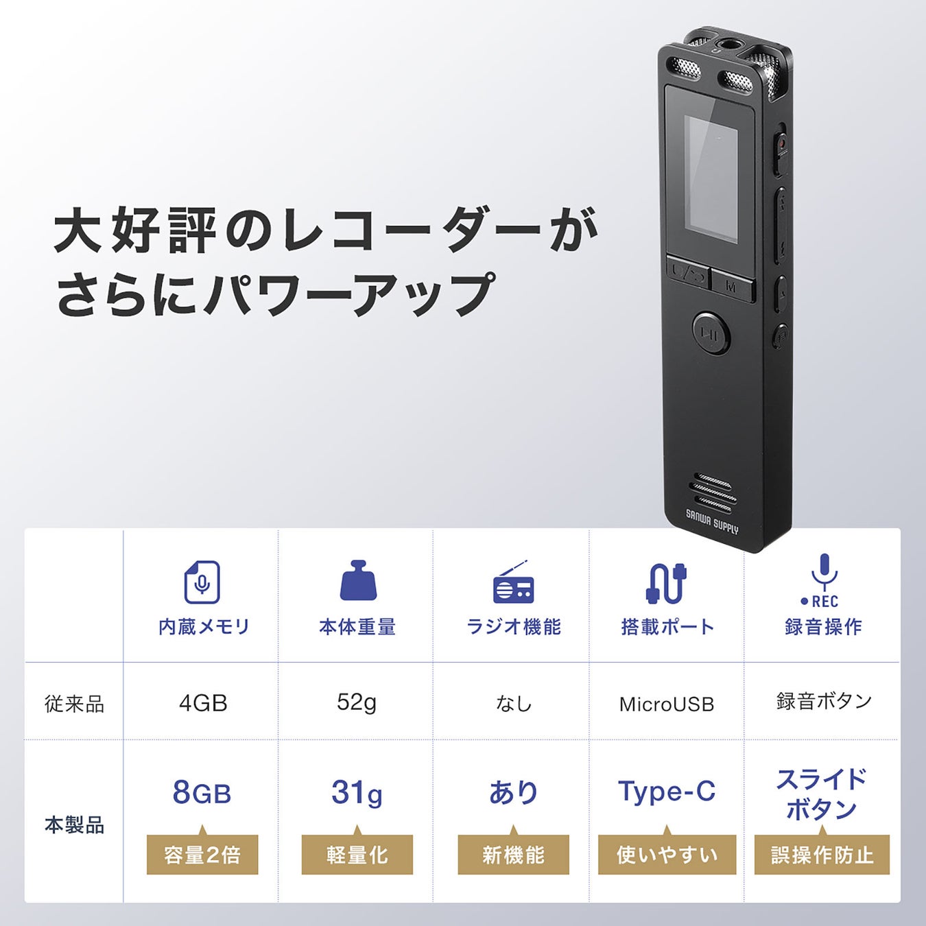 ボイスレコーダー 8GBメモリ内蔵 microSDカード対応 ICレコーダー 小型 軽量 ラジオ機能付き 録音 記録