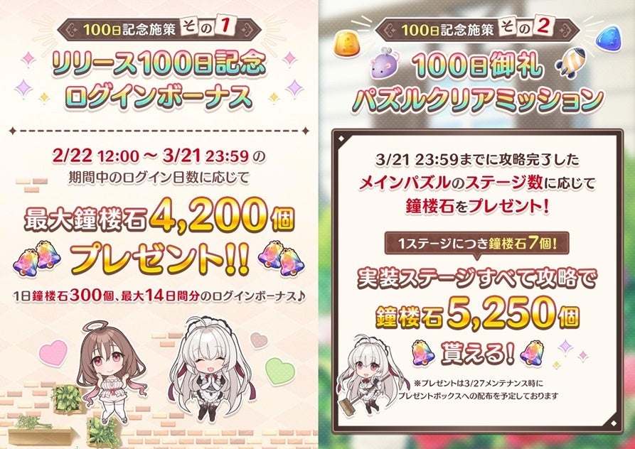 3月21日までに攻略完了したメインパズルのステージ数に応じて「鐘楼石」がプレゼントされます。