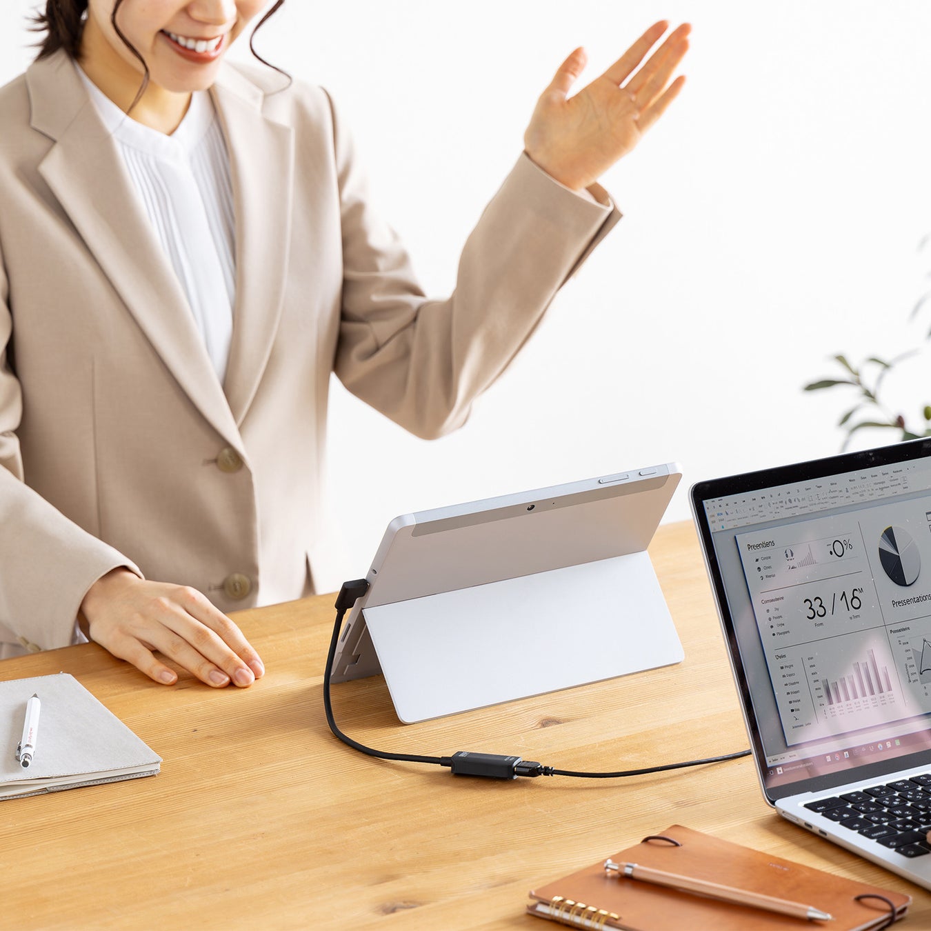 タブレットを使用したプレゼンや商談時もケーブルがごちゃつかず、スマートに配線できます。