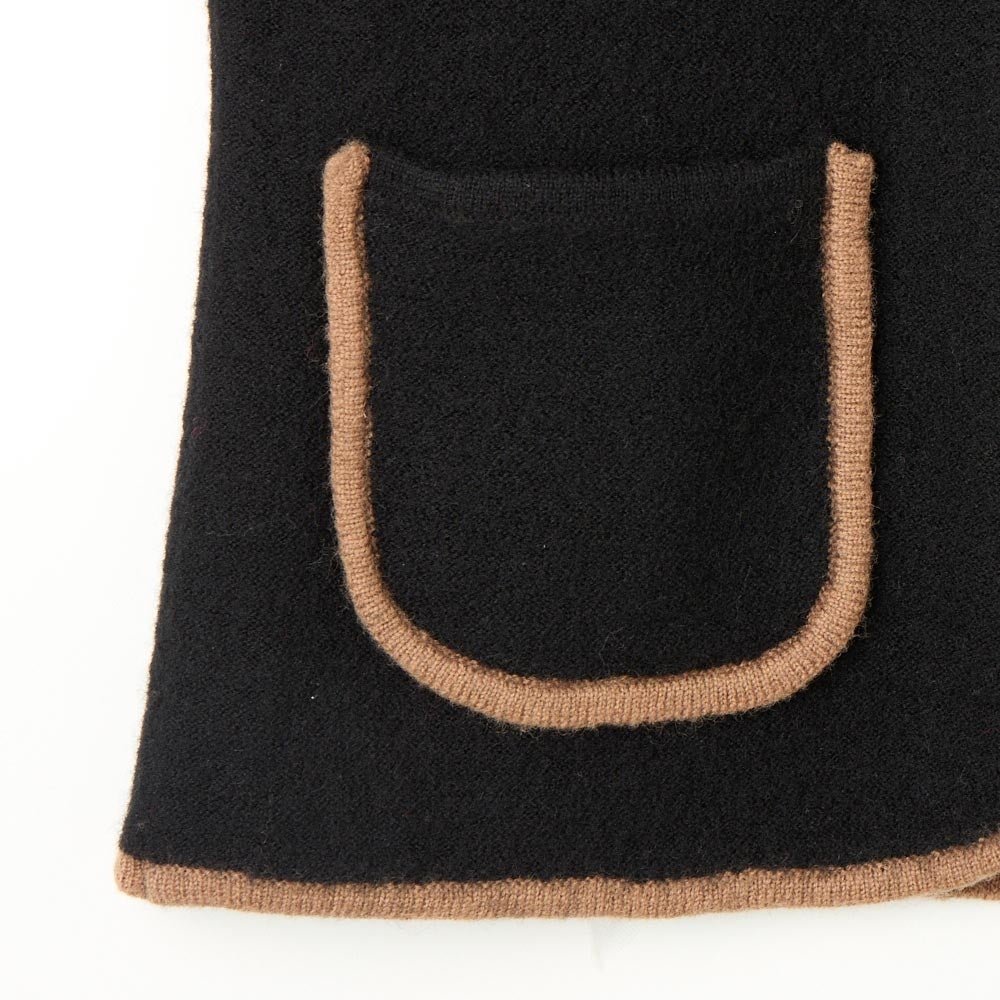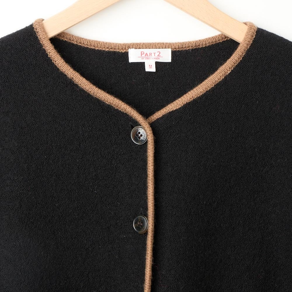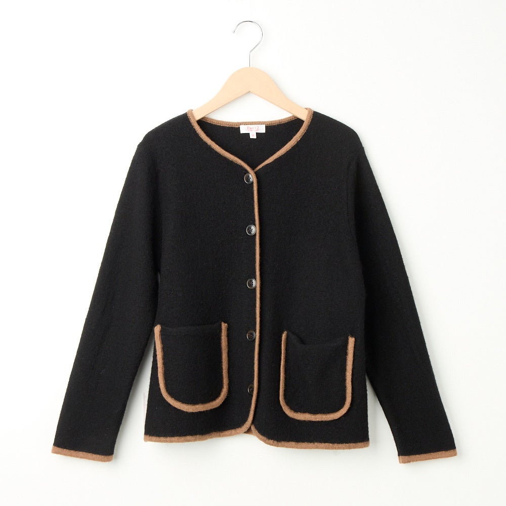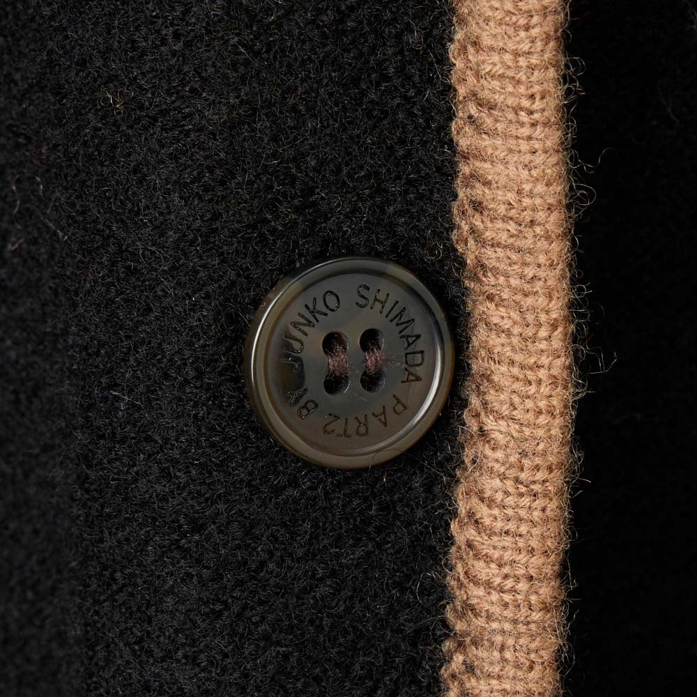 毛100%の素材を圧縮させてつくられたニットジャケットです。リラックス感のある着心地でありながらきちんと見えるところから島田順子さんのお気に入りの素材で、1980年代からコレクションで披露する作品に継続的に使用されています。