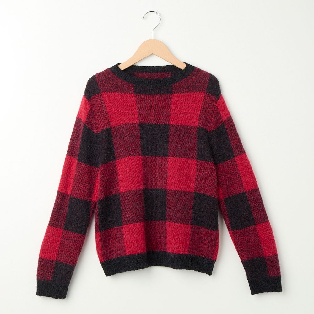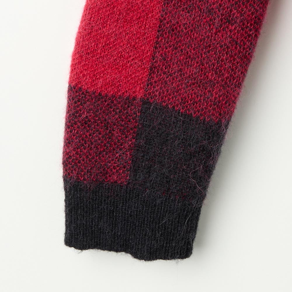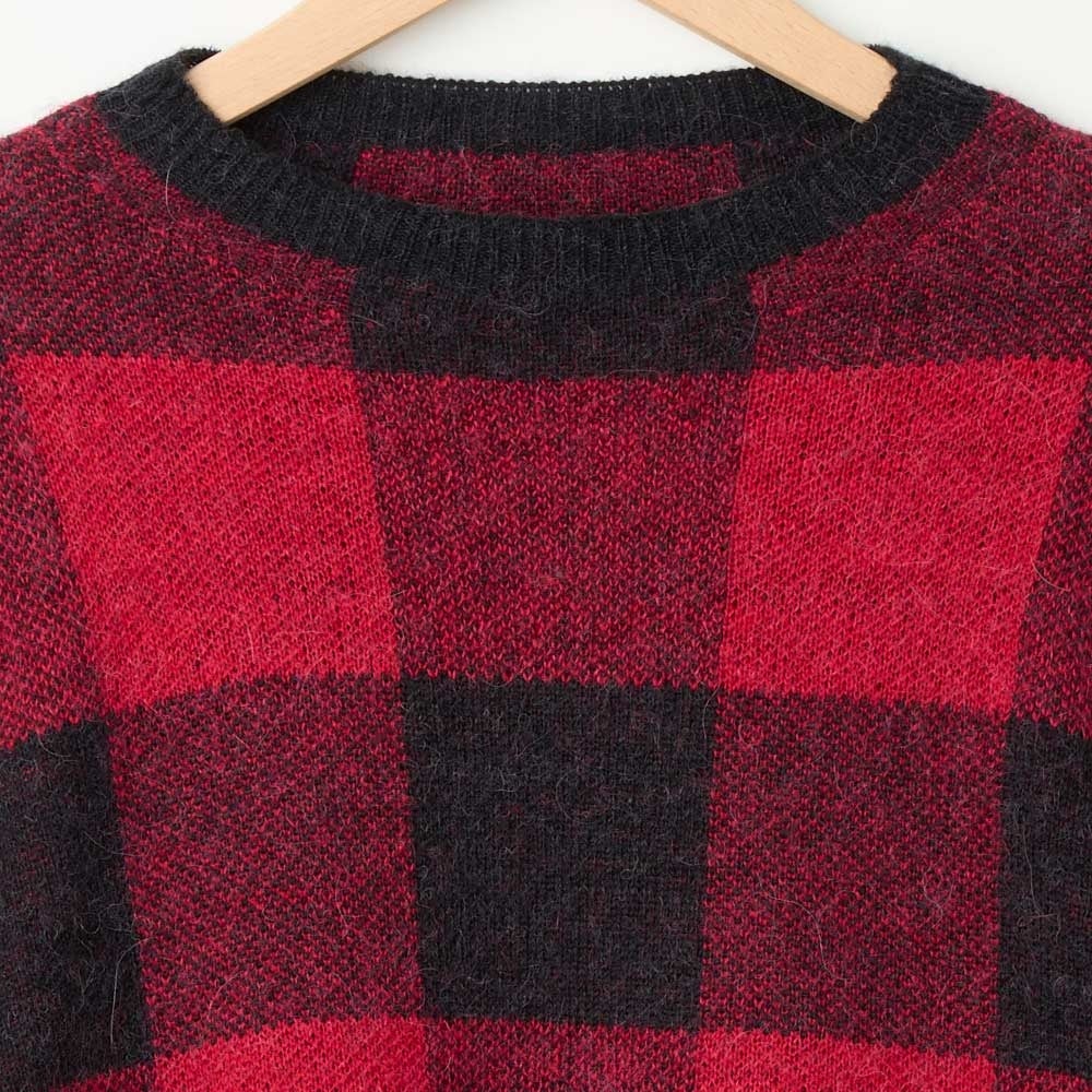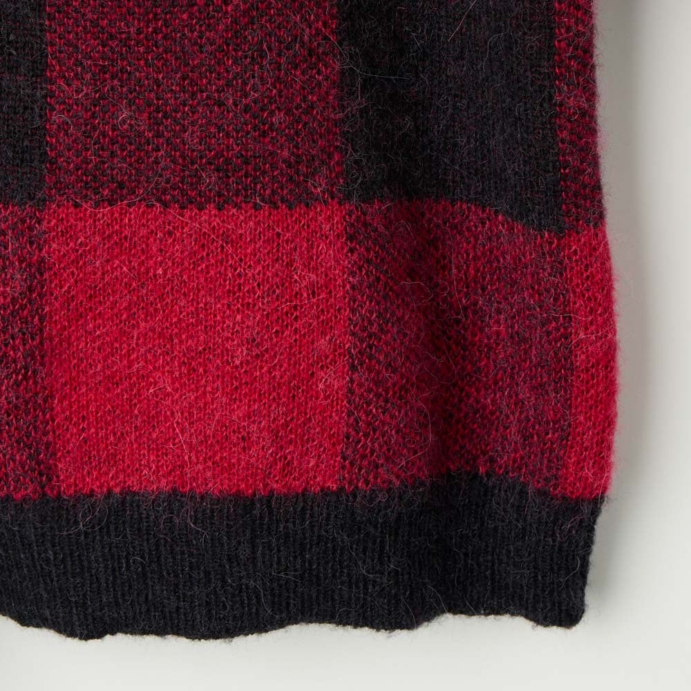 ビンテージ感のある大きなブロックチェックがインパクトを与えるニットです。軽くてあたたかい風合いをだすためアルパカの毛を加えた糸を使っています。