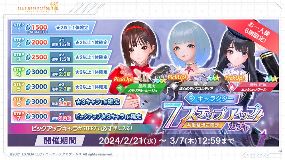 有償希想石で10連ガチャを引くごとにSTEPが1つアップ!STEP7では、それぞれのガチャで★3キャラクター/URフラグカードの出現確率が3倍になるほか、ピックアップ★3キャラクター1体/URフラグカード1枚が確定でゲットできます!