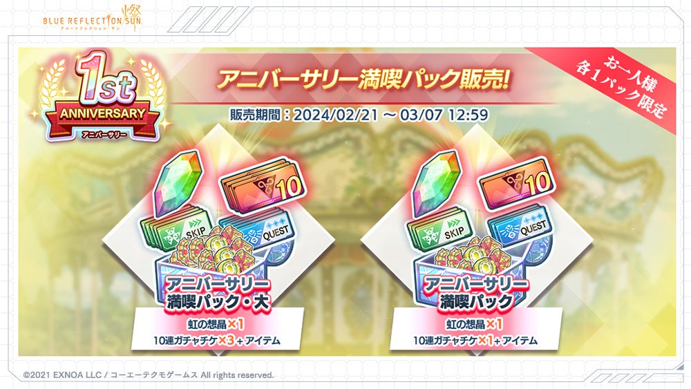 UR限界突破アイテム「虹の想晶」などが入ったアニバーサリー限定の特別なアイテムパックをショップにて販売中です!どうぞお見逃しなく!
