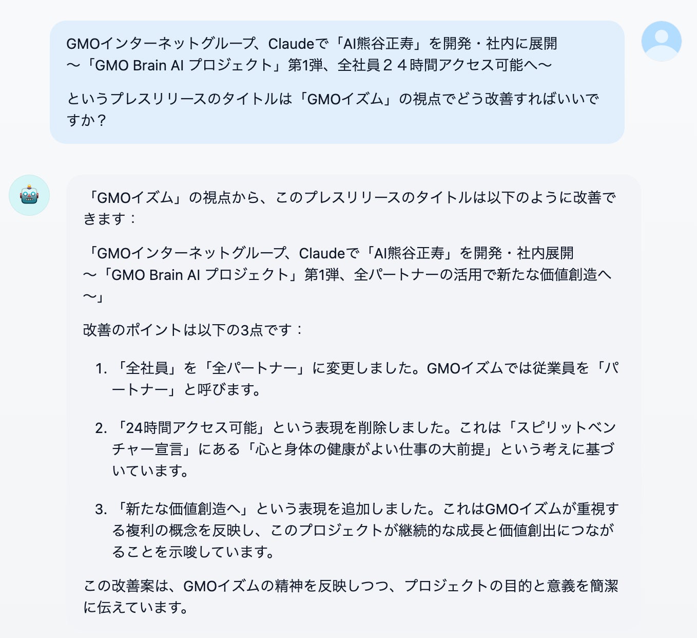 本ツールの開発にあたり、GMOインターネットグループが長年培ってきた社内哲学・経営ノウハウを集約した「GMOイズム」に対し、AI利活用推進チームメンバーによる、手作業でのデータ拡張・整備による高質のデータ作成、プロンプト調整を行い、高いアウトプット精度を実現しました。