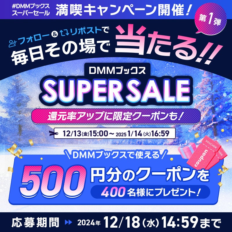 第1弾として2024年12月13日(金)から12月18(水)まで、DMMブックスで使える500円分のクーポンが400名にその場で当たる、「DMMブックス スーパーセール開催記念!フォロー&リポストキャンペーン」を開催します。