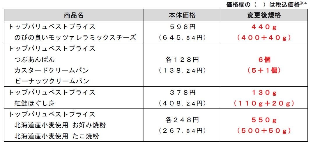 またトップバリュは、原材料の調達から計画生産、効率化を追求した店舗への配送等のサプライチェーン全体での合理的なコスト削減に努め、10月末まで※1に普段の暮らしでお客さまが 購入される頻度が高い商品約100品目を増量し、数量限定で発売します。さらに11月中旬からは、一部商品の値下げを予定しています※2。