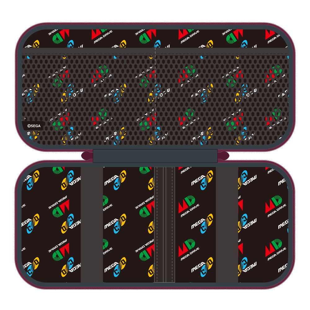 ケース本体はしっとりとした質感の合皮にメガドライブロゴを型押ししており、ジッパーはカートリッジスロットのワインレッドを表現。そして内側はメガドライブとメガCD、2種類のロゴを散りばめた総柄仕様になっています。