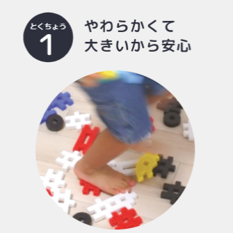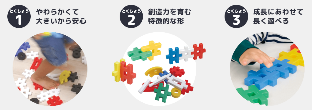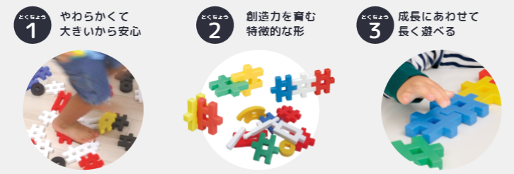 また、パーツが大きいため、1.5歳からお使いいただいても誤飲の心配がなく、お子さまのファーストブロックにぴったりです。最初は積む&壊す遊びからスタートし、食べ物や線路などに見立てる遊び、パーツを自由に組む遊び、そして頭の中で考えたものを作品にする遊びへと発展し、小学生になるまで長く遊んでいただけます。