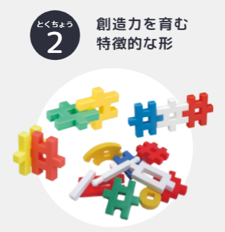 Gakkenニューブロックの最大の特長は、独特のパーツの形。ただタテに積むだけではなく、ヨコにもナナメにも自由に組むことができるので、組み合わせは無限大です。頭のなかで思い描いたものをなんでも形にすることができるため、創造力や立体認知力を大きく育みます。