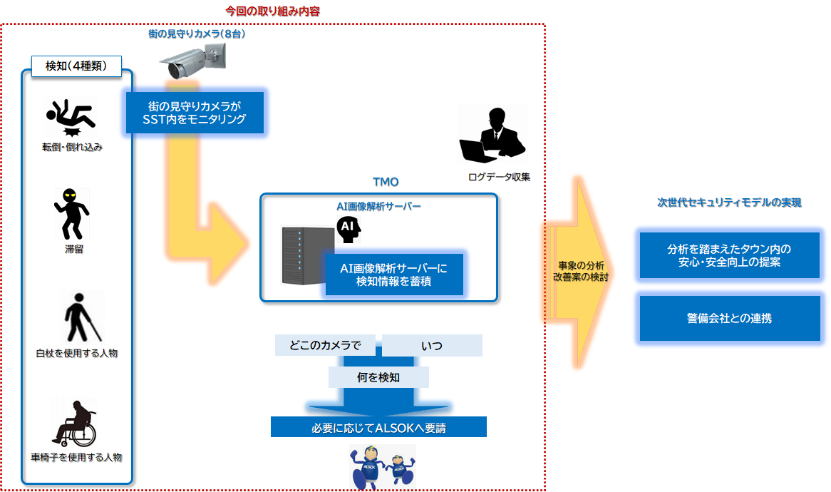 具体的には、i-PRO株式会社製カメラ映像の画像解析を行い、「滞留」「転倒」「白杖」「車椅子」といった4種類の検知要件を満たす事象を検知した場合、タウンマネジメント機関(Town Management Organization、以下TMO)のセキュリティシステムへ、警備行動の要否確認を求める通知をおこないます。