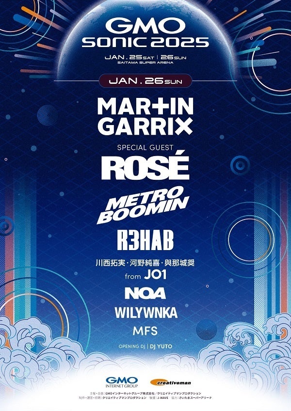 GMOインターネットグループ(グループ代表:熊谷 正寿)と株式会社クリエイティブマンプロダクション(代表取締役:清水 直樹)が、2025年1月25日(土)・26日(日)にさいたまスーパーアリーナにて開催する、国内最大規模のダンスミュージックフェスティバル「GMO SONIC 2025」の出演アーティストのフルラインナップを発表します。