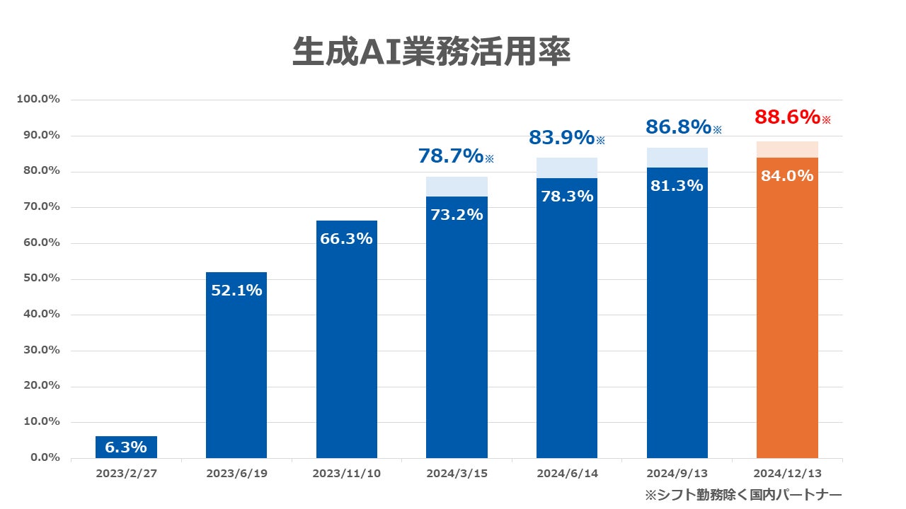 国内パートナー(シフト勤務除く)の88.6%が生成AIを活用(前回調査差+1.8ポイント)。