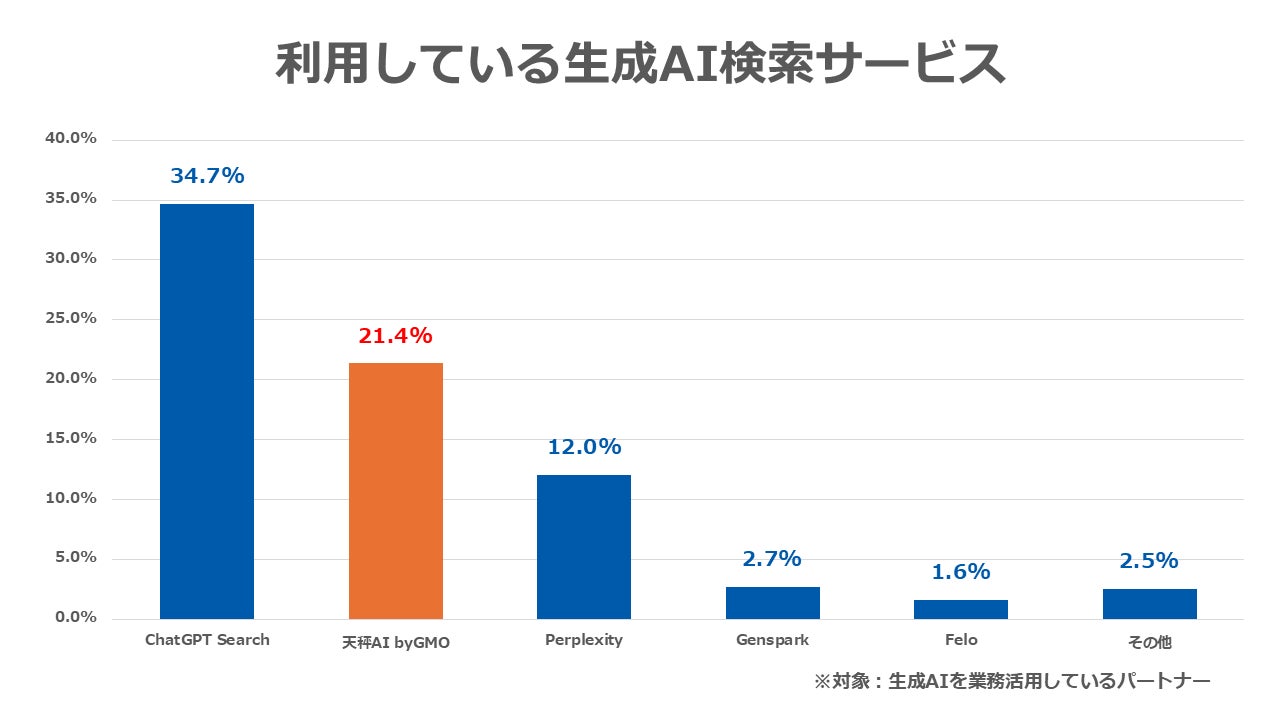 自社提供の生成AI検索「天秤AI byGMO」の業務利用率が、「ChatGPT Search」(34.7%)に次ぐ21.4%の利用率(https://tenbin.ai/)