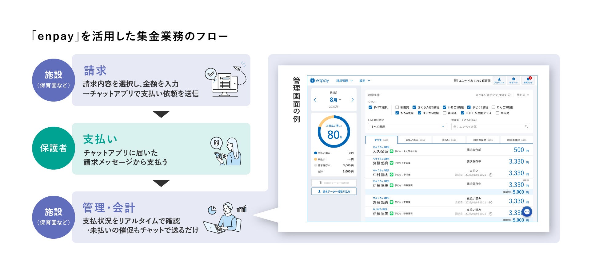 保育・教育業界は、従来現金集金が主流となっており、パソコン利用業務も少ないことから、いまだ現金でのやりとりが多く存在しています。集金前後には金額の周知・領収書の発行・未払いの保護者への催促など多岐にわたる事務作業が施設側に発生し、保護者側も現金を用意する手間があります。このような課題に対しエンペイは、チャットアプリなどデジタル時代のニーズを取り込みながら、請求から決済、入金消込管理までをワンストップで解決するソリューションを提供しています。