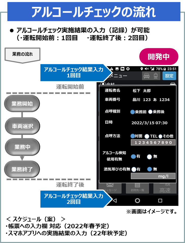 運転者名と運転車両、点呼種別(運転前/業務開始前・運転後/業務終了後)、アルコール検知使用有無、酒気帯びの有無等の情報入力と管理が可能(2022年秋、実装予定)