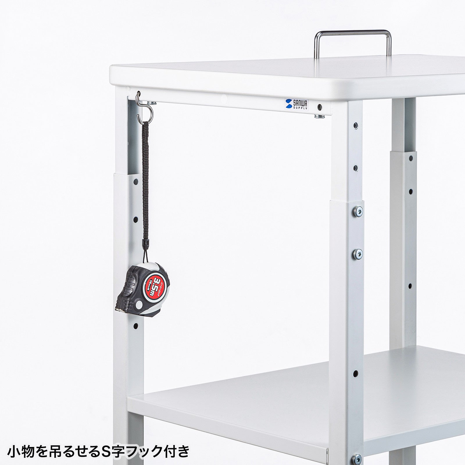 バーコードリーダーやメジャーなどの小物を吊るせるS字フック付きです。天板下のフレームの四隅に取り付けることができます。
