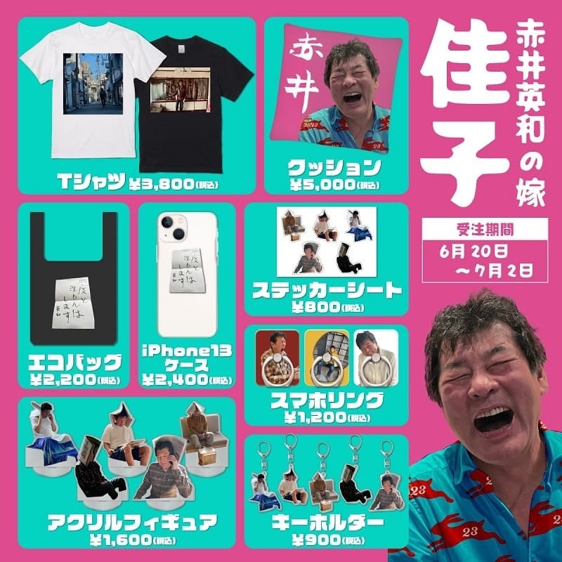 2023年6月20日(火)より、日常をありのまま切り取った愛が溢れるツイートで話題の【赤井英和の嫁 佳子】のヴィレッジヴァンガード限定グッズがオンラインストアにて発売決定!!実際に投稿された写真を使用したグッズの数々は必見!!期間限定のオンライン受注販売のみになりますのでお見逃しなく!