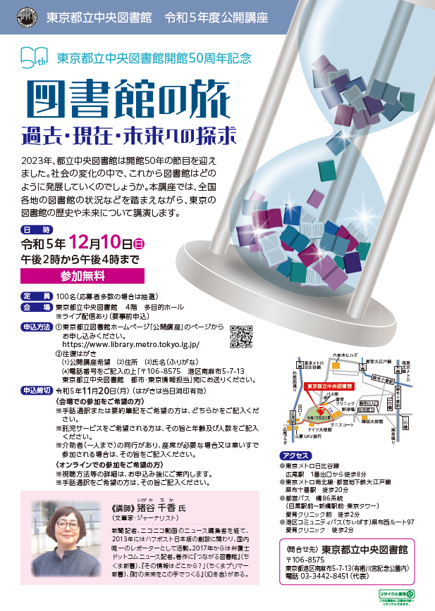 2023年、都立中央図書館は開館50年の節目を迎えたことから、「東京の図書館」をテーマに、公開講座「図書館の旅 過去・現在・未来への探求」を開催します。