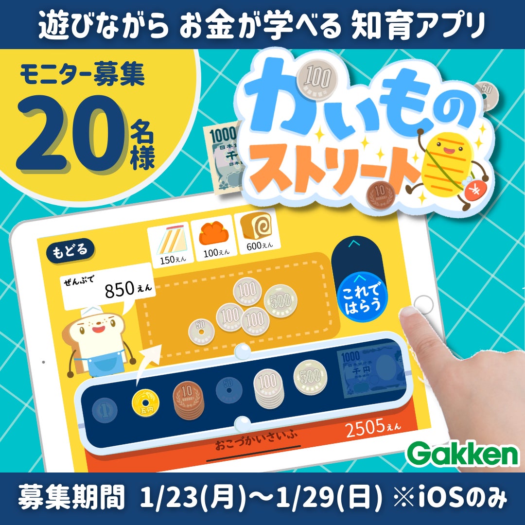 株式会社 Gakkenでは、1月30日公開予定の知育アプリ『学研のおかね学習アプリ かいものストリート』(無料、アプリ内課金あり)の全コンテンツを無料でお試しいただき、実際に本アプリを利用している「写真や動画」「ご感想」をご自身のTwitterかInstagramに投稿くださるモニター様を募集いたします。