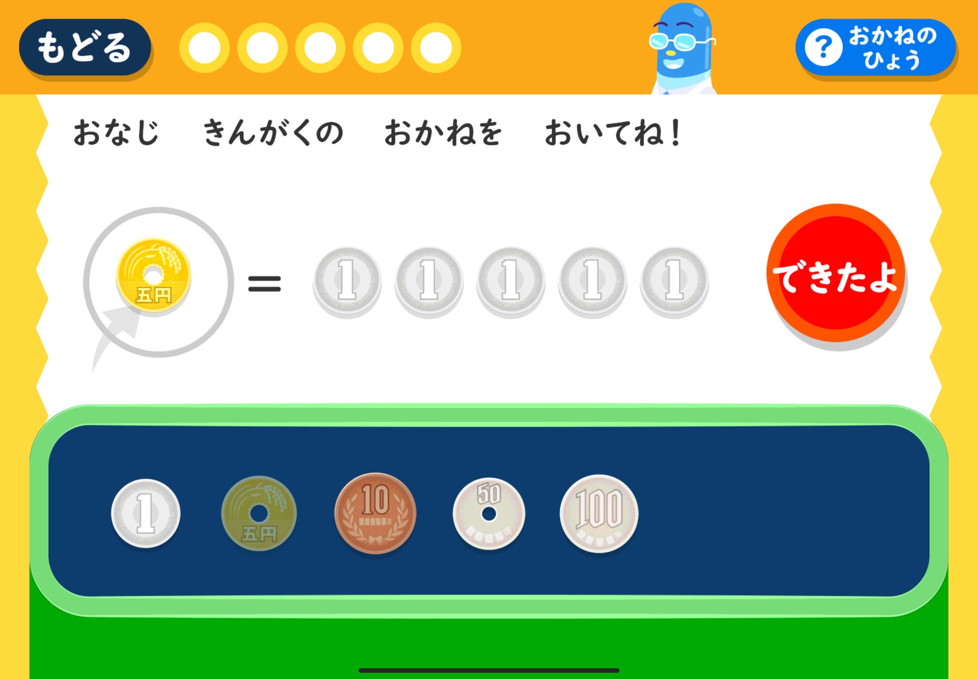 ミニゲームで両替やおかねのたし算を学べます。