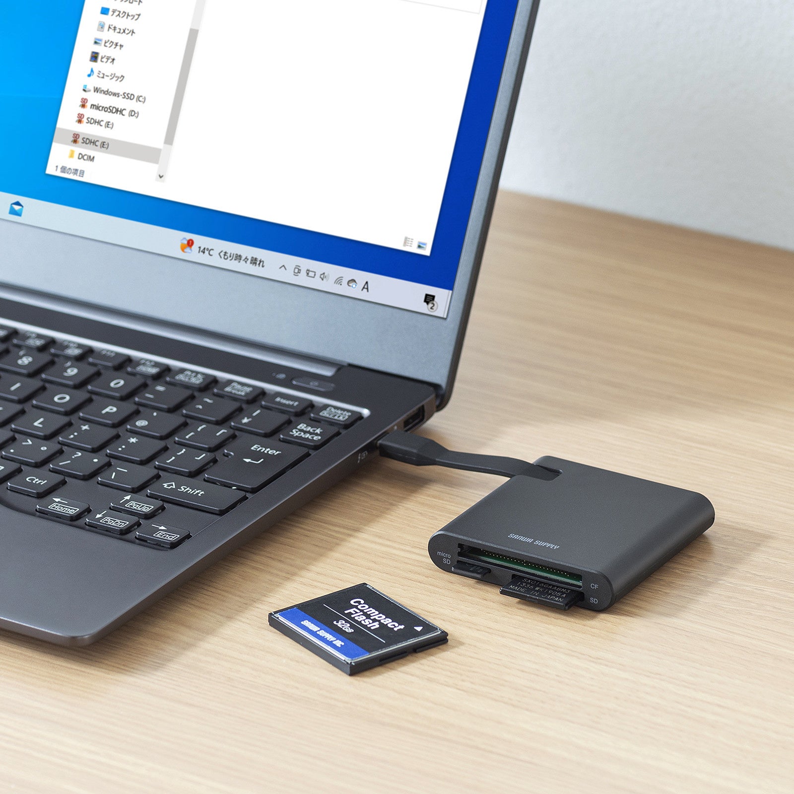 USB2.0の約10倍速い、USB 5Gbpsのスーパースピードモード(5Gbps・規格値)に対応しています。メディアを挿入して機器に接続するだけで簡単に写真や動画などを超高速転送できます。