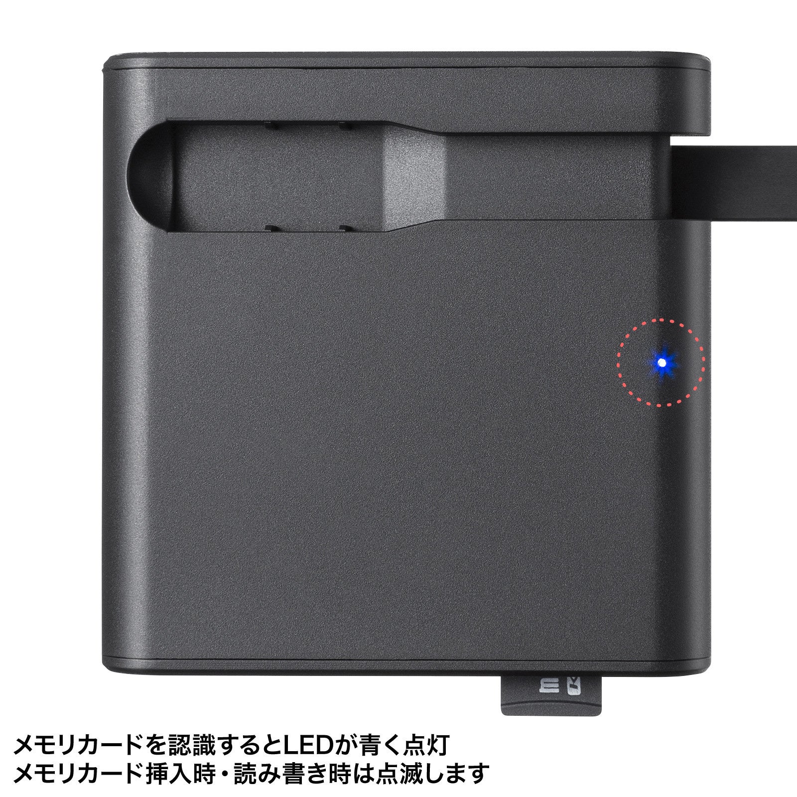 製品背面に、メモリーカードを認識すると青く点灯するLEDランプ付きです。メモリーカード挿入時、読み書き時は点滅します。